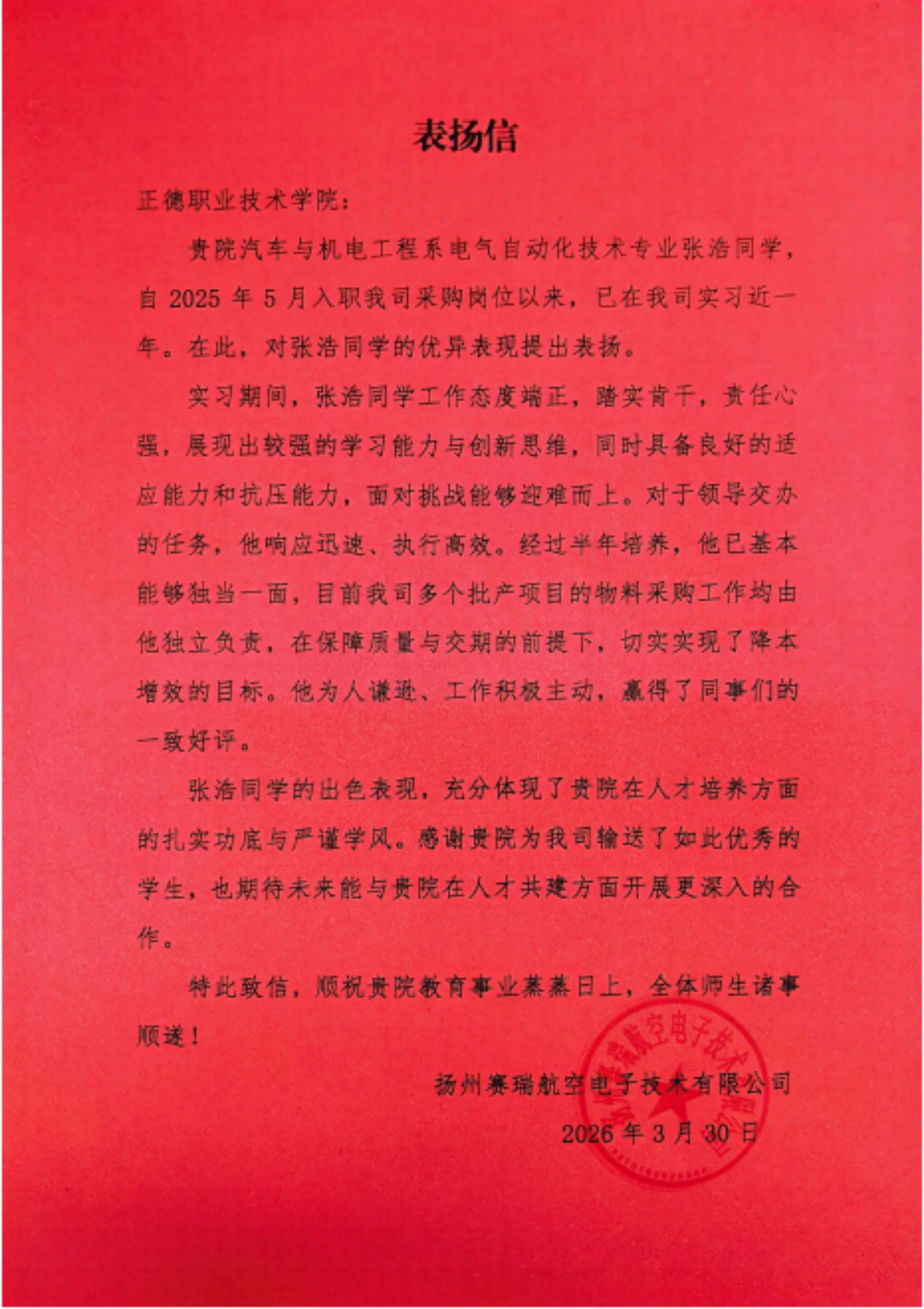 近日,我院收到中国航空工业集团扬州赛瑞航空电子技术有限公司(以下简称“赛瑞”)发来的专属表扬信,信中对我院汽车与机电工程系电气自动化技术专业张浩同学在实习期间的突出表现给予高度评价与专项表扬,这是我院深化校企协同育人模式、培育高素质技术技能人才取得的又一亮眼成果。