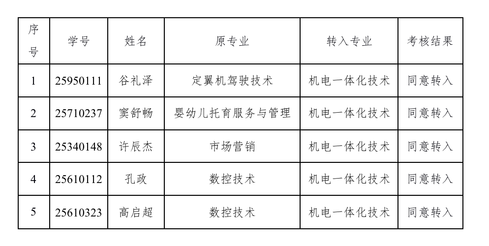 根据学院《关于做好2025-2026-I学期转专业工作的通知》的精神,依据《汽车与机电工程系 2024 级、2025 级转专业考核方案》实施要求,由转专业考核小组对申请学生进行综合考评。经考核小组审议,一致通过结果如下: