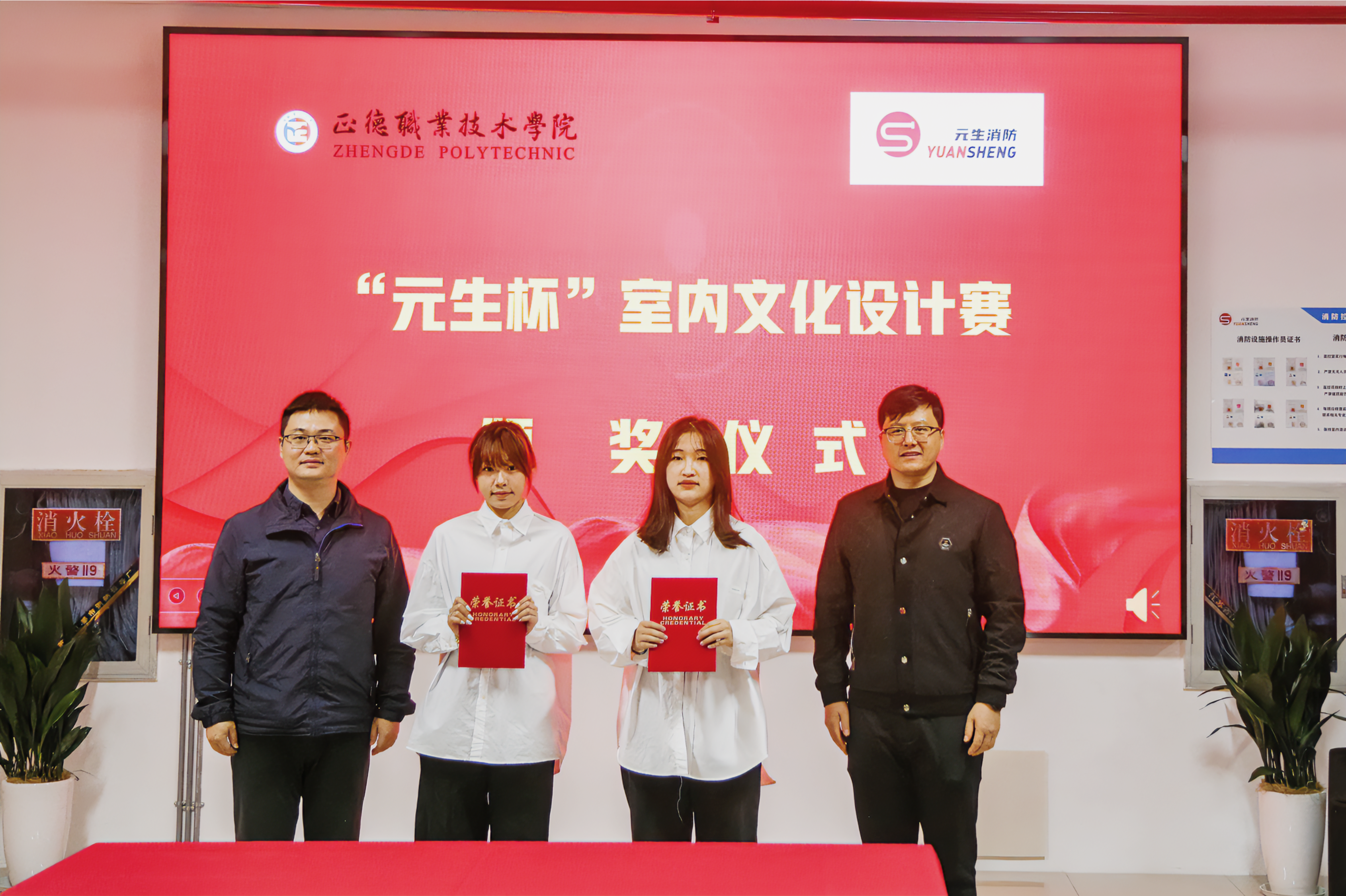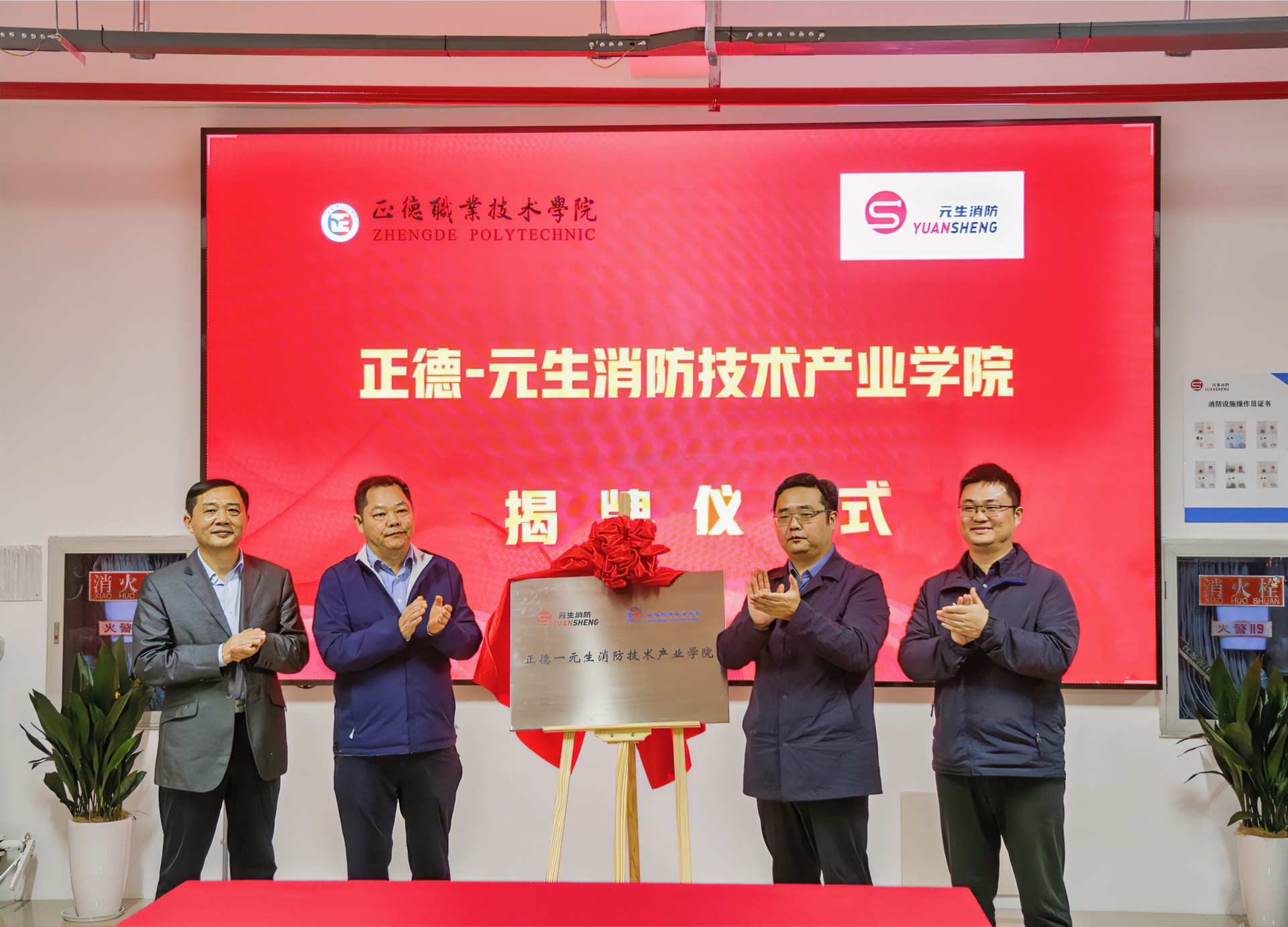孙永荣、江爱华、刘臻、张周周共同为“正德-元生消防技术产业学院”揭牌。