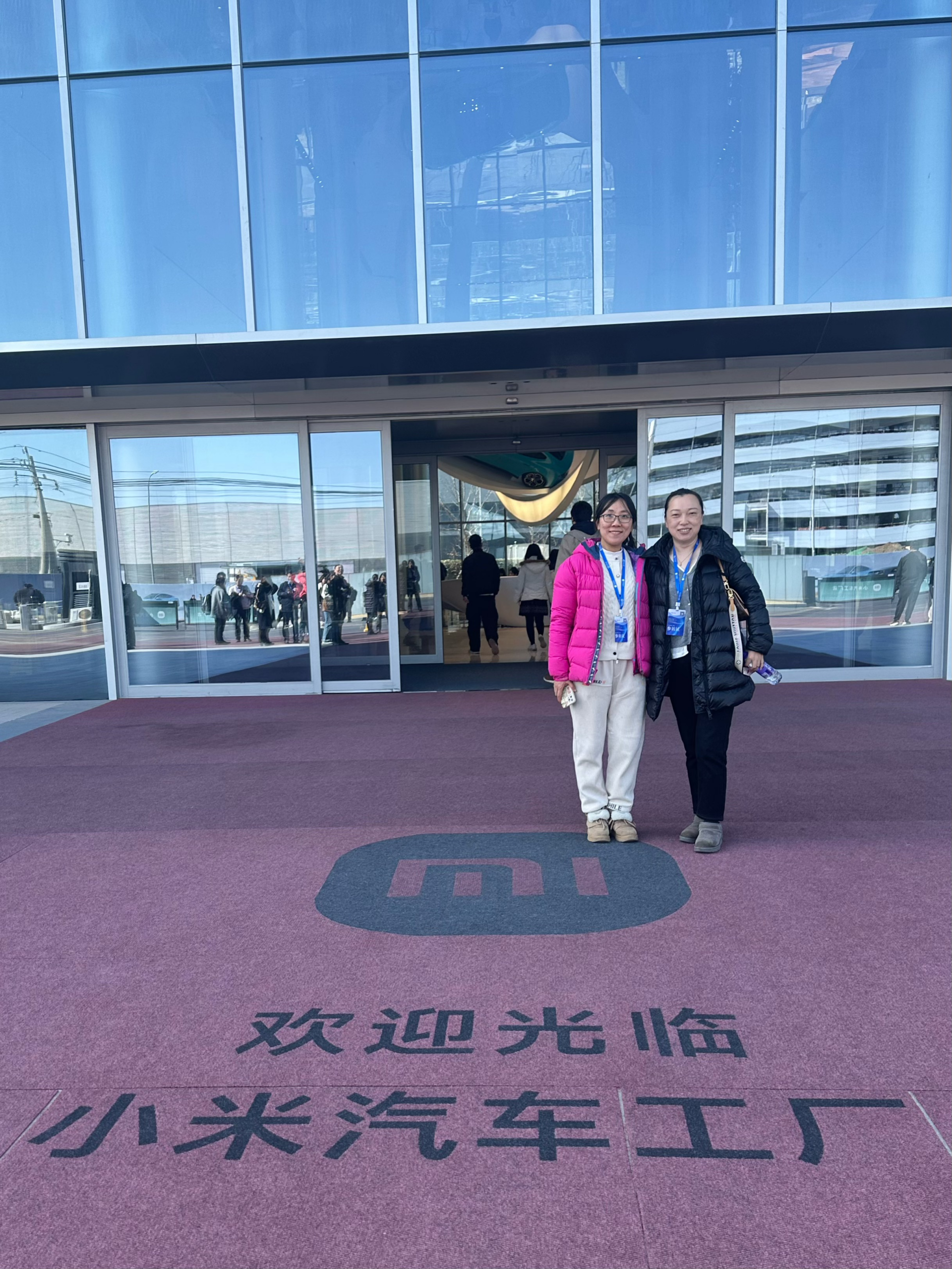 活动中,龚君教师聆听了企业精心组织的供应链和生态链讲座。讲座中,企业相关负责人详细阐述了小米汽车独特的供应链管理模式,如何高效整合全球优质资源,保障零部件供应的稳定性与高品质;同时,深入解读了小米生态链体系,展示了小米汽车如何凭借生态链的协同优势,在智能互联、售后服务等方面构建差异化竞争力,为在场人员带来了一场产业思维的盛宴。同时还实地参观了小米汽车超级工厂,在参观过程中,先进的生产工艺令人目不暇接。压铸车间内,大型压铸设备精准运作,将金属材料高效成型;冲压车间里,自动化冲压生产线快速而稳定地将板材冲压成汽车零部件;车身车间中,众多机器人臂协同作业,以毫米级的精度完成复杂焊接,构建起坚固的车身框架;涂装车间实现了高度自动化的无人喷涂,确保车身漆面均匀、亮丽且持久;总装车间里,智能化物流系统与工人紧密配合,有序地将各类零部件组装成一辆辆崭新的小米汽车。