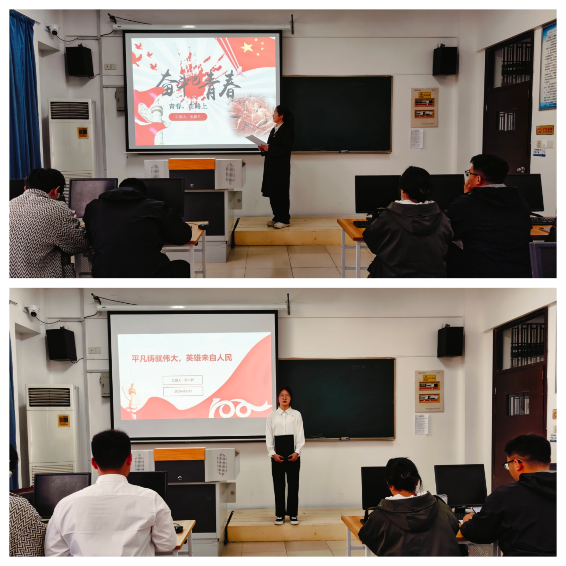 汽车与机电工程系团总支书记李浩文老师在赛前鼓励同学们:“用汗水浇灌事业,用奋斗成就梦想,用奋进践行使命”,让同学们以更积极的心态来面对这次技能大比武。比赛内容分为党史知识竞赛与个人风采展示演讲两部分,竞赛以闭卷考试的形式考察选手们对于党团知识的掌握情况。考试内容围绕中国共产党党史,青年大学习每期考题组成。而个人风采演讲中同学们通过PPT陈述,进行了内容丰富、逻辑清晰的个人展示。