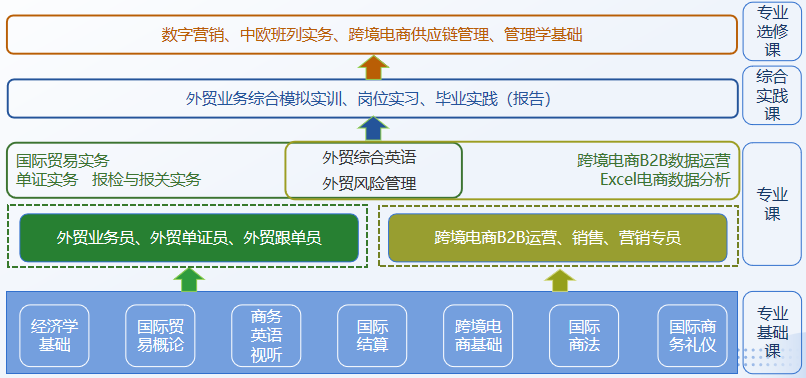 本专业面向外贸业务员、外贸单证员、外贸跟单员、跨境电商 B2B 运营专员、跨境电商B2B 销售专员、跨境电商 B2B 营销专员等岗位(群),培养德智体美劳全面发展,具有工匠精神和信息素养,掌握扎实的科学文化基础和国际贸易、国际结算、国际商法、外贸英语等知识,具备外贸接单、制单、跟单、跨境电商 B2B 业务操作等能力,同时具备良好的职业素养、敏锐的市场洞察力、突出的创新创业意识的高素质技术技能人才。