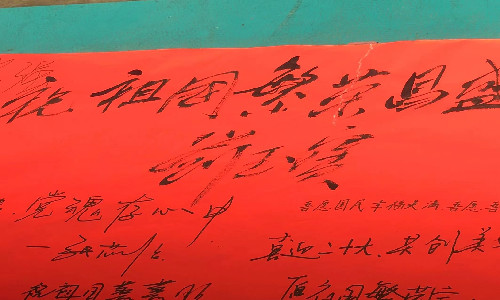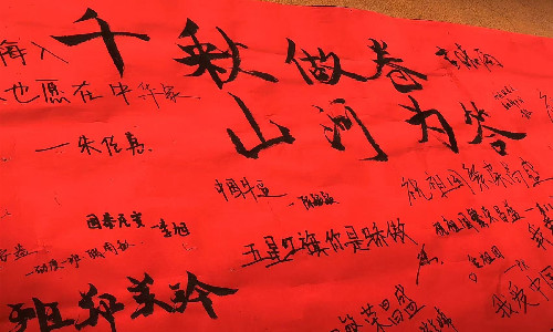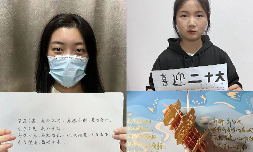 研墨铺纸,挥毫泼墨,经管青年戴着口罩,有序排队,一一写下对党对国对二十大的祝福。“永远跟党走,唱响中国梦”“祝福祖国繁荣昌盛,国泰民安”“千秋做卷,山河为答”“风雨与共,百年荣光”......