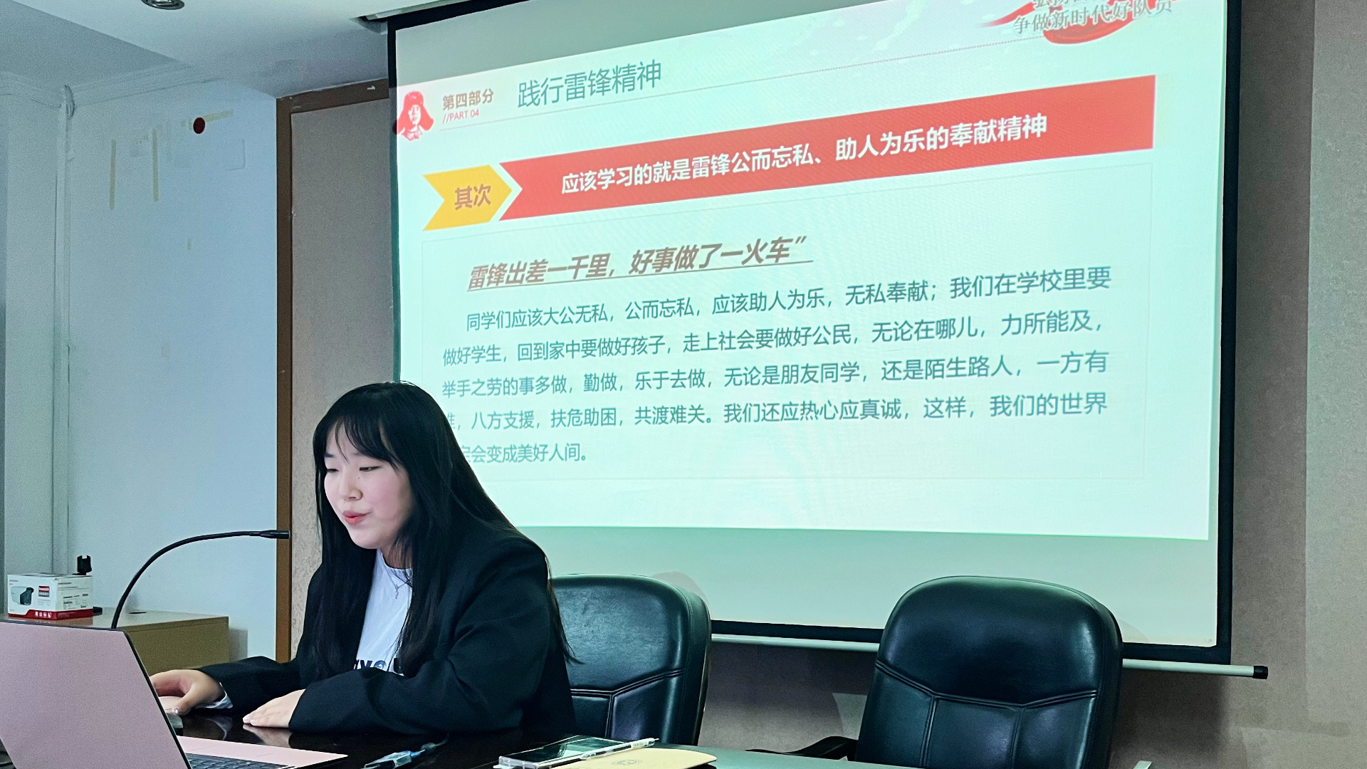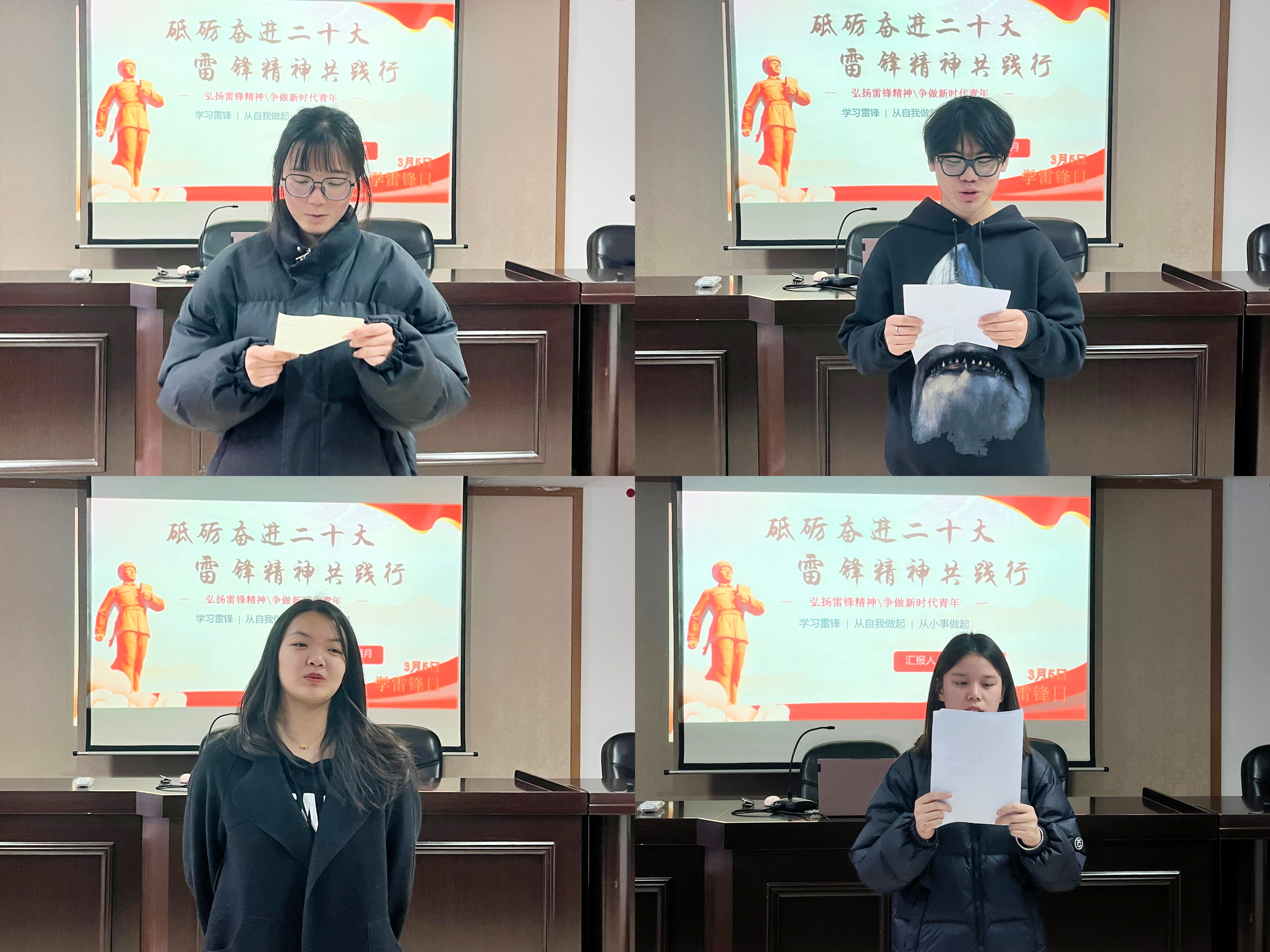 首先,主讲人用视频的方式带领大家回顾了雷锋同志短暂且光辉的一生,接着部分学生从讲雷锋故事、读雷锋名言、等方式让大家充分领悟雷锋精神。