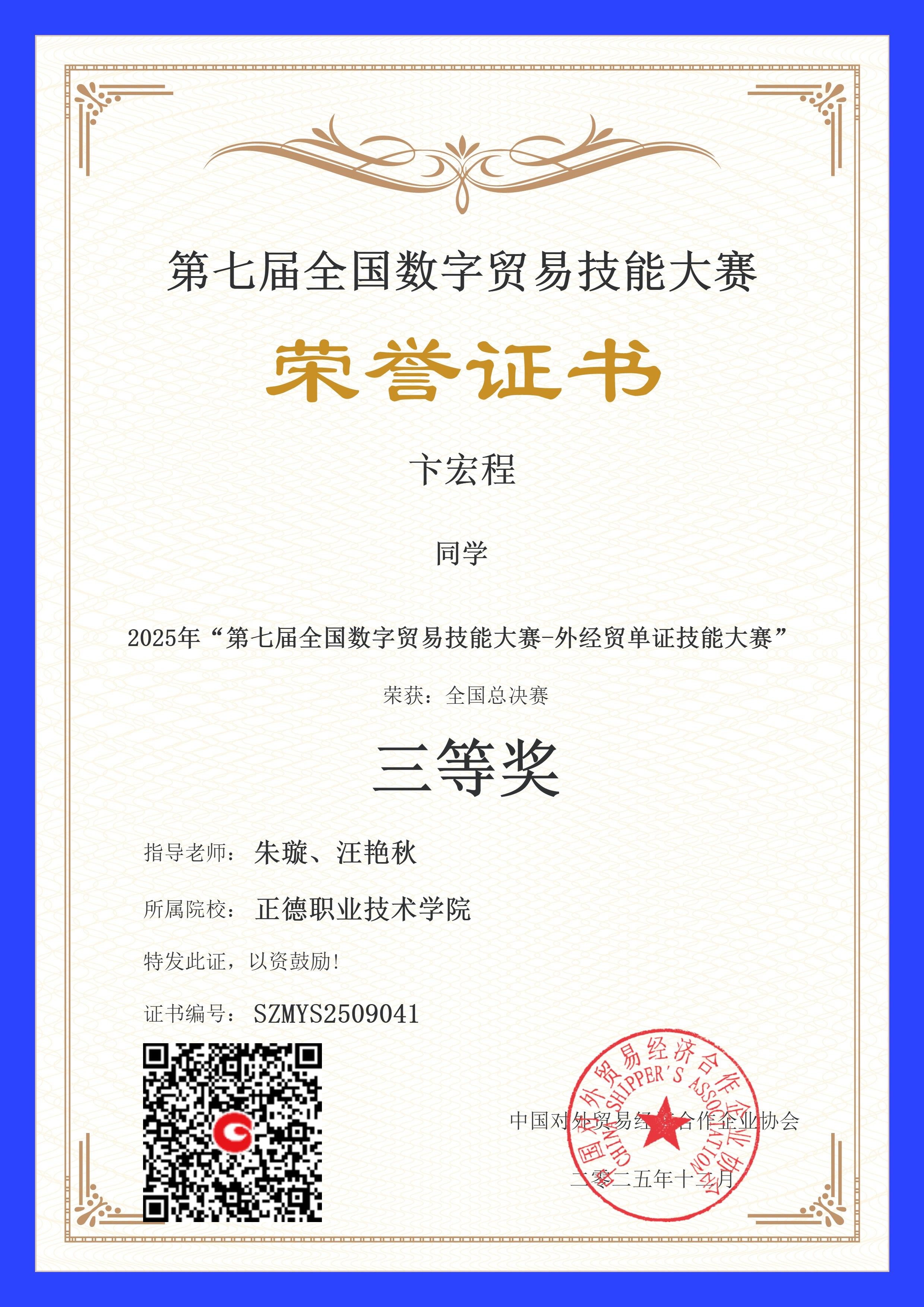 继第七届全国数字贸易技能大赛“数字国际贸易技能”赛项获奖后,国际经济与贸易专业24级学生卞宏程、付国一、王珂璠组成的参赛队在该赛事另两个赛项中再创佳绩,分别获得“跨境电商数字化运营”赛项(2025年11月25日-29日)团体二等奖1项,“外经贸单证”赛项(2025年11月30日)个人三等奖3项。