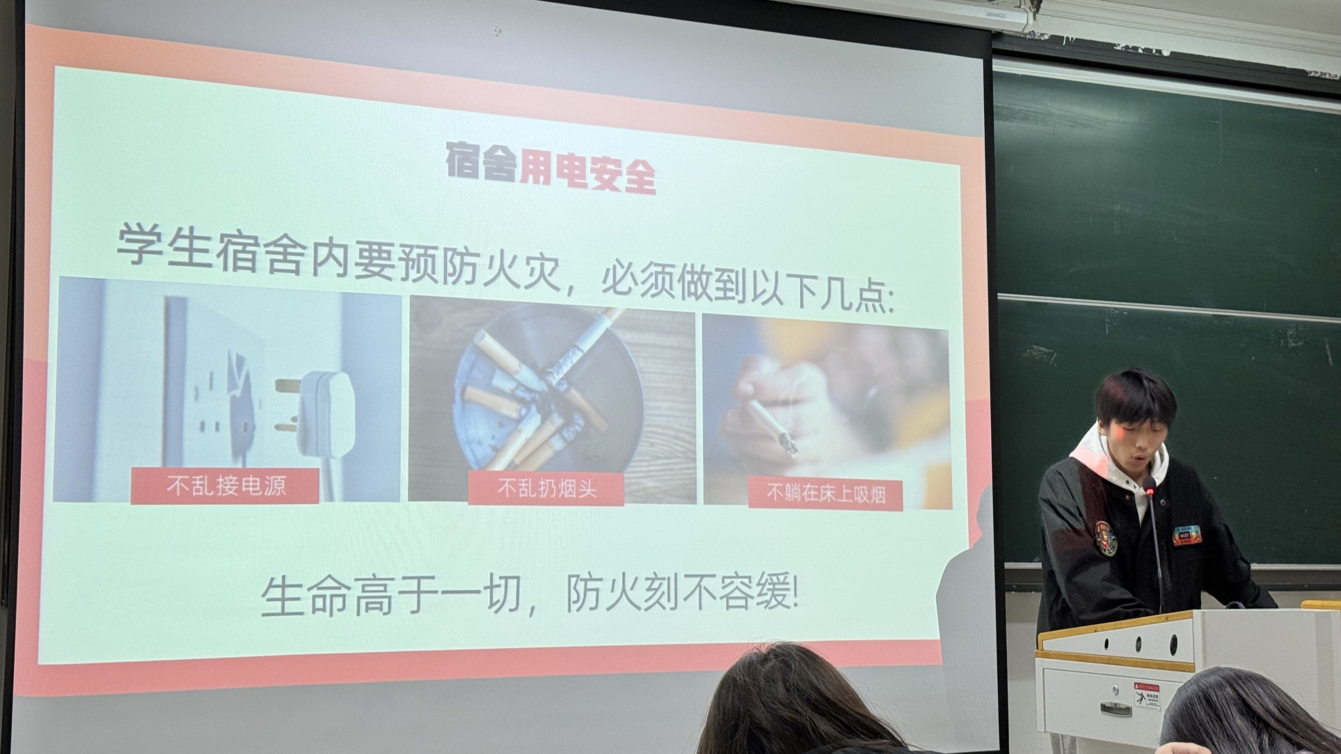 在班会的最后,王露洋通过展示宿舍易发生火灾的物品摆放、违规电器等照片,给大家做了安全提醒。通过此次班会,同学们不仅了解了消防安全知识,还学会了如何将这些知识应用到日常生活中。我们相信,只有每个人都认真对待消防安全,才能共同创造一个更加安全的生活环境。