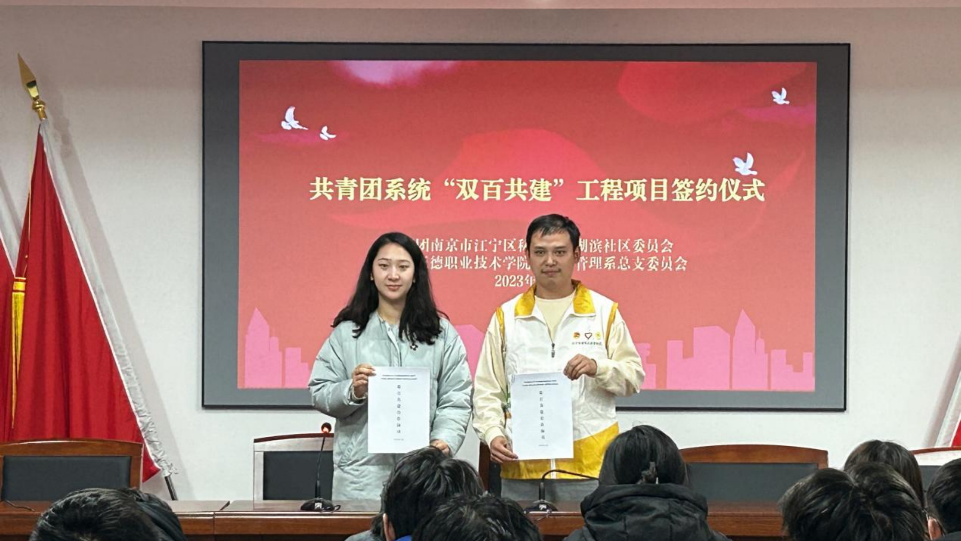 在“国际志愿者日”来临之际,为进一步弘扬“奉献、友爱、互助、进步”的服务精神,全面深化校地融合共建,凝聚校地力量助力“大学生社区实践计划”,形成“双向服务、双向受益”的互动模式,11月29日,经济与管理系赴秣陵街道湖滨社区开展“双百共建”签约仪式暨“社区有我,青春报到”活动,经管系党支部书记周慧、湖滨社区团总支书记王平、经管系团总支书记倪冰慧及20名团员青年到场参会。