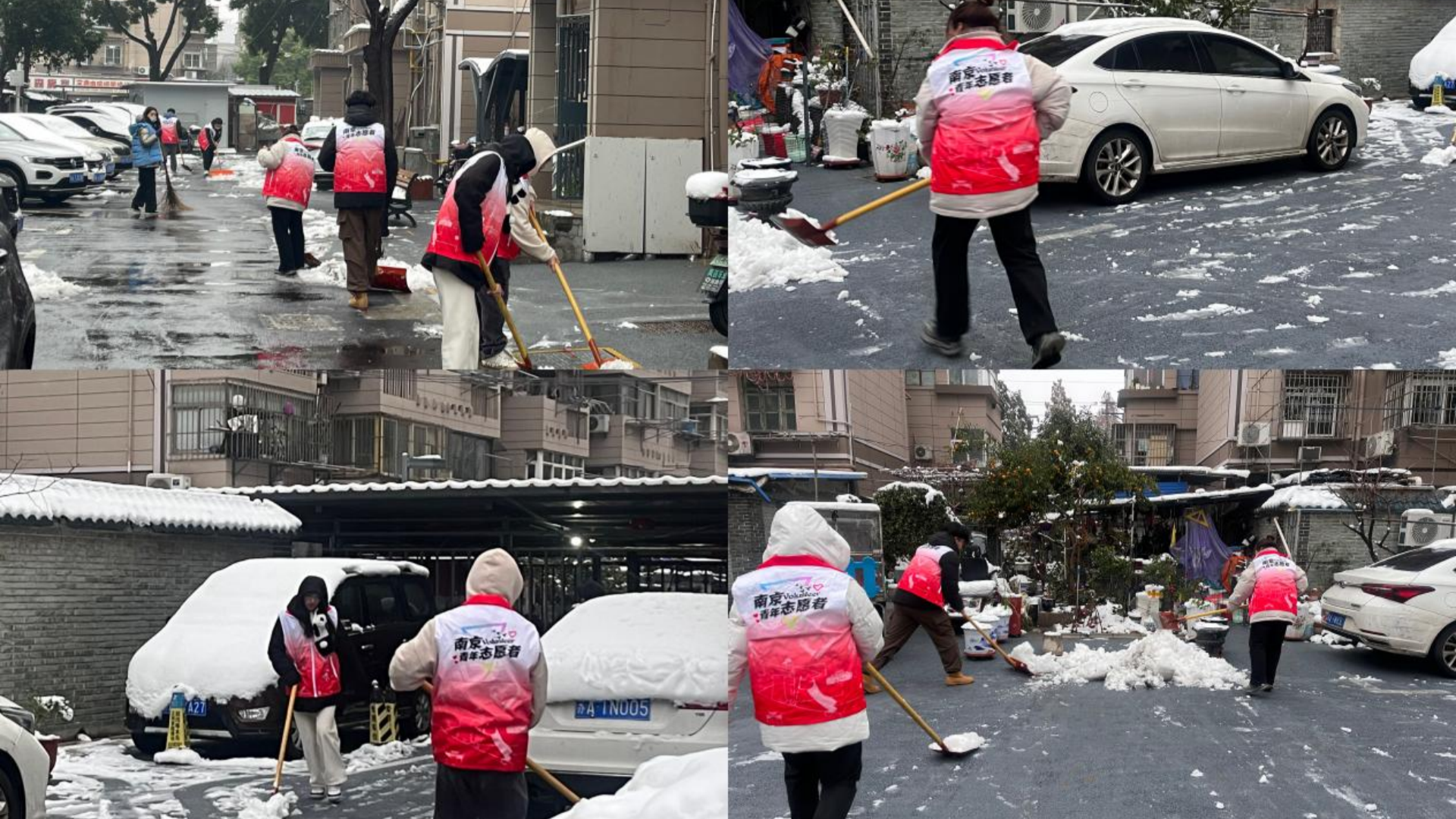 志愿者们身穿红马甲,手持扫帚、铁锹等工具,团结协作,共同作战。他们有的铲雪,有的扫雪,还有的搬运雪,配合默契,干劲十足。他们在扫雪的过程中,展现了良好的团队形象和高度的社会责任感。