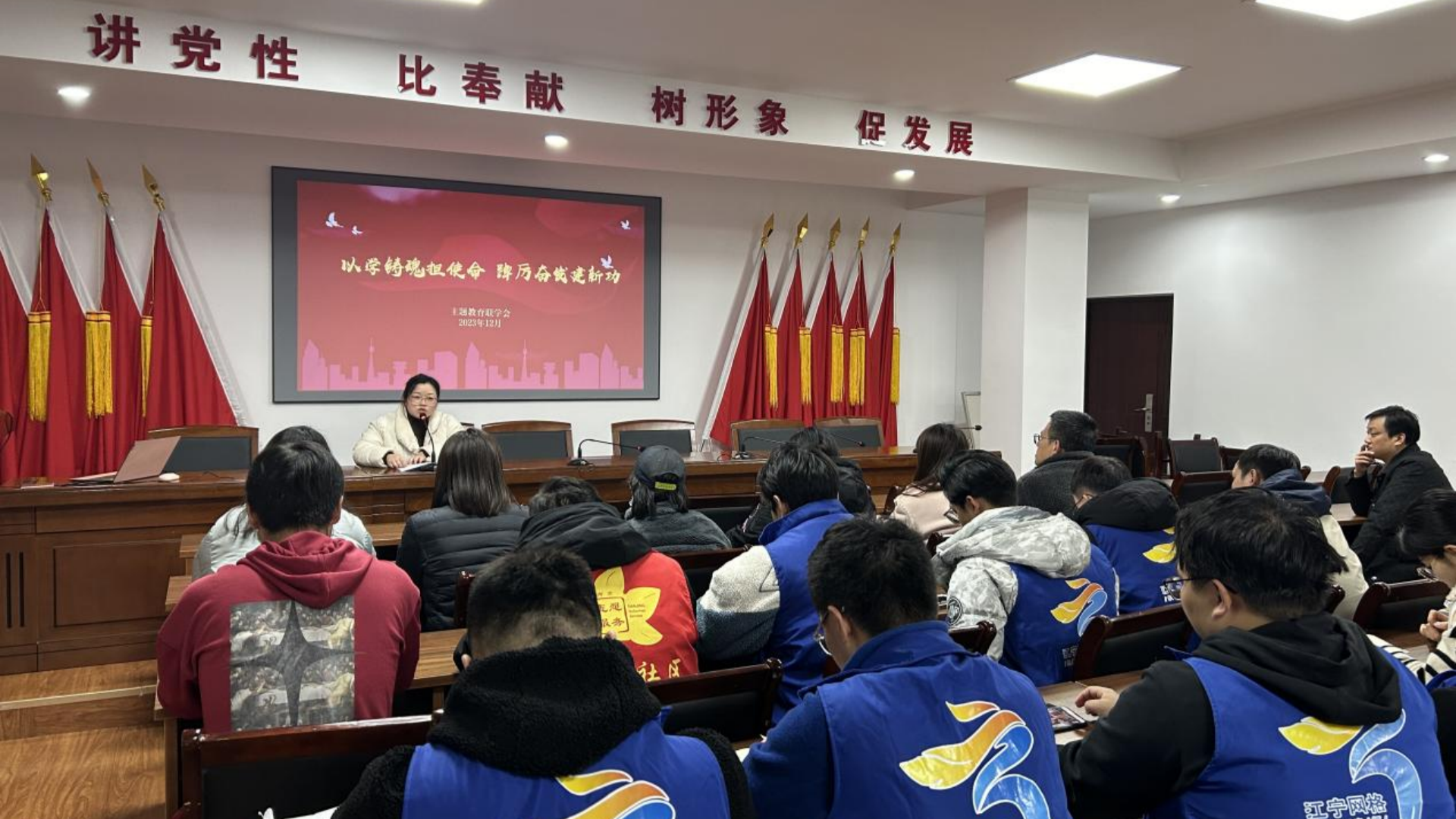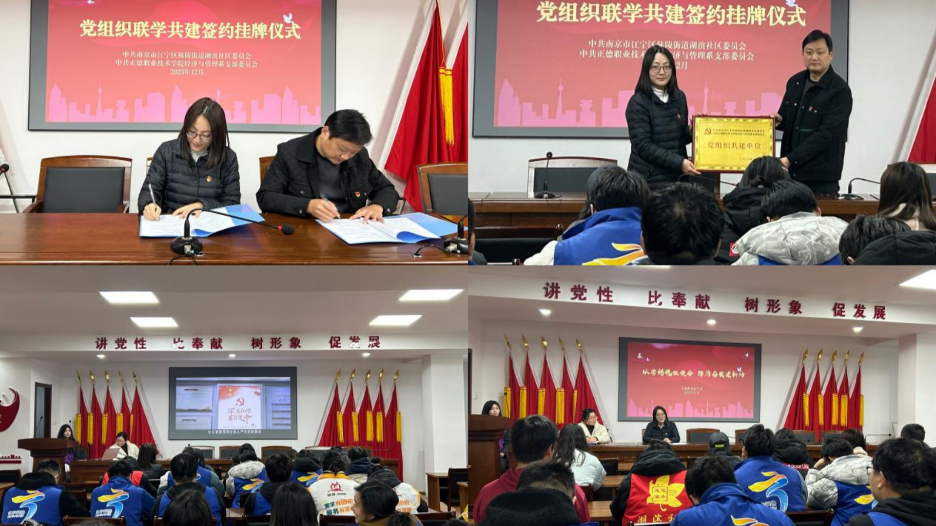 为充分发挥党建引领,凝聚共建合力,加强校地合作,构建资源共享、优势互补、互促发展的党建新格局,12月11日,经济与管理系党支部赴江宁区秣陵街道湖滨社区党委开展“以学铸魂担使命,踔厉奋发建新功”联学共建活动。参加本次活动的有湖滨社区党委书记王祥富、党委委员王菲、团委书记王平,经济与管理系党支部书记周慧、组织委员呙竹云、团总支书记倪冰慧以及社区党员、师生党员、社区工作人员和团员青年。活动由湖滨社区党委委员王菲主持。