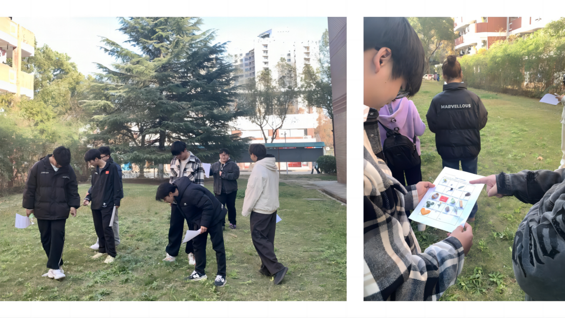 沐浴在明媚的阳光下,感觉整个世界都变得温暖而美好了。同学们纷纷调动想象力,努力搜寻心中与线索相符的答案,整个校园都可以看见他们奔波的身影。大家的欢声笑语也为校园添上了一抹不一样的色彩。在经过1小时的寻找后,很多同学表示原来校园里有这么多他们平常没有发现的美景,仿古桥石狮子的表情、多功能报告厅墙壁上的字、紫藤长廊藤曼的触感、钢琴湖拂面的风、无人机绿草坪上的阳光、9号楼银杏树上的大鸟窝、阳光下泥土地的灰尘味......虽然每天身处校园,却很少会驻足下来,运用五感去观察校园的美丽,去加深与自然、与他人、与当下的联结。