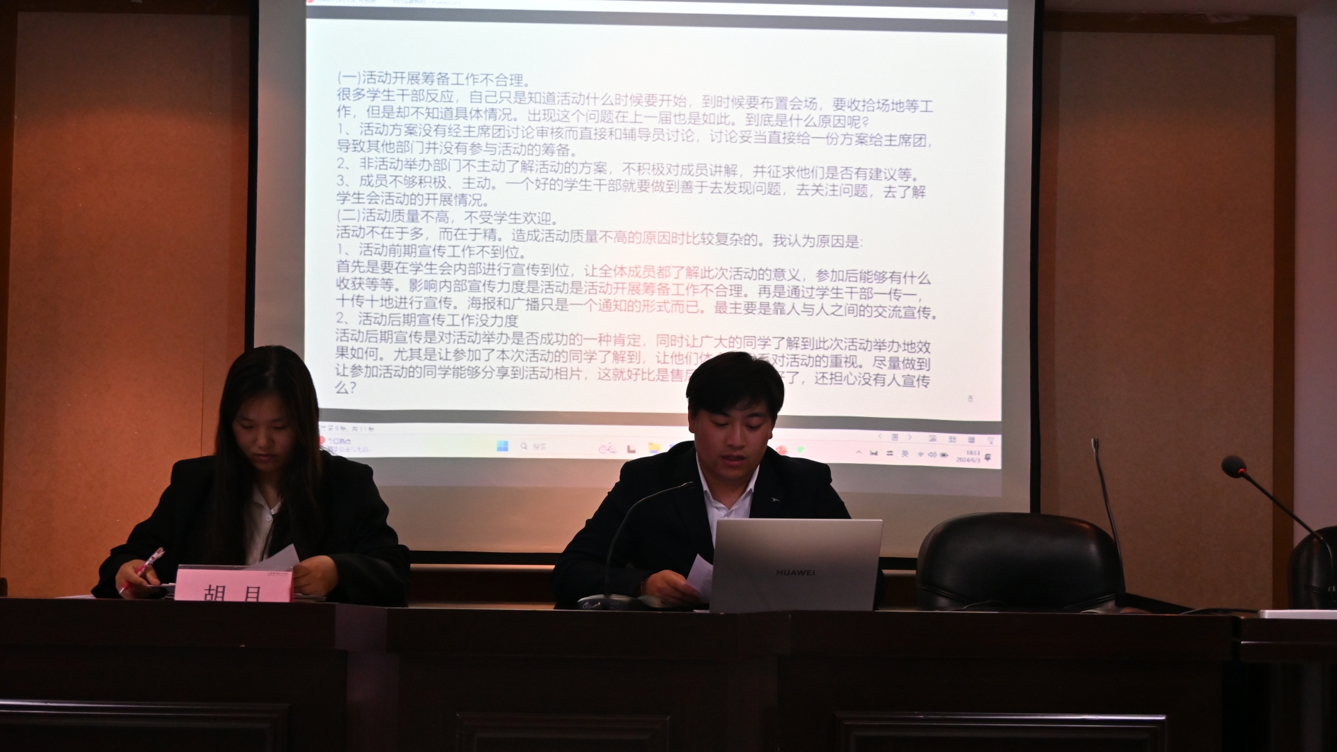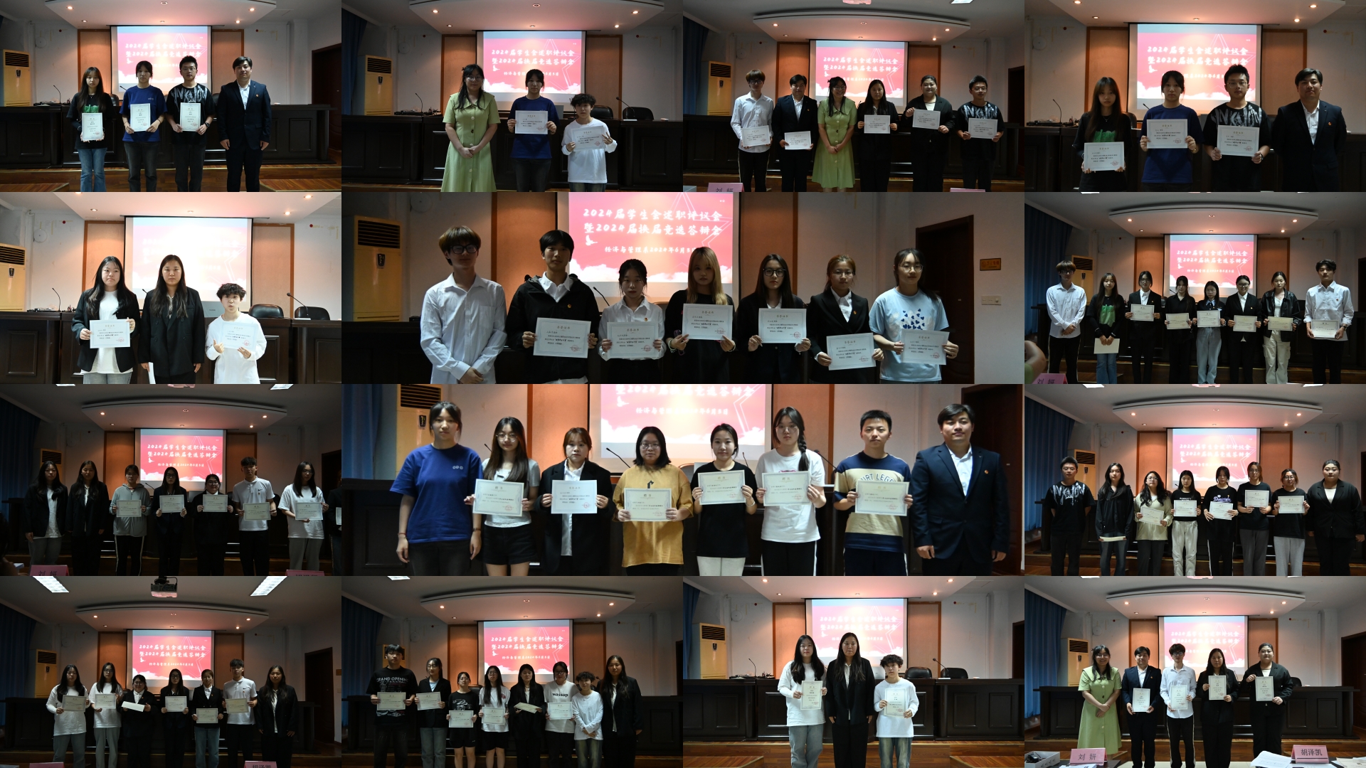 学生会及团总支各部门部长依次上台进行述职。在针对本学期部门发展进行回顾总结的基础上,着重体现团队工作要点与个人能力提升,对现阶段的问题进行总结反思并提出了下一阶段工作的解决方案。本次述职体现了各位学生干部对部门工作内容的深入了解以及他们认真负责的工作态度,同时也显露出他们对经济与管理系各部门未来发展的深切关怀与期待。学生干部们卓越的风采为经济与管理系学生会及团总支各部门的日常工作运转提供了充分的保证。最后刘妍为部门成员、部门干事及负责人颁发相应的奖状与聘书。