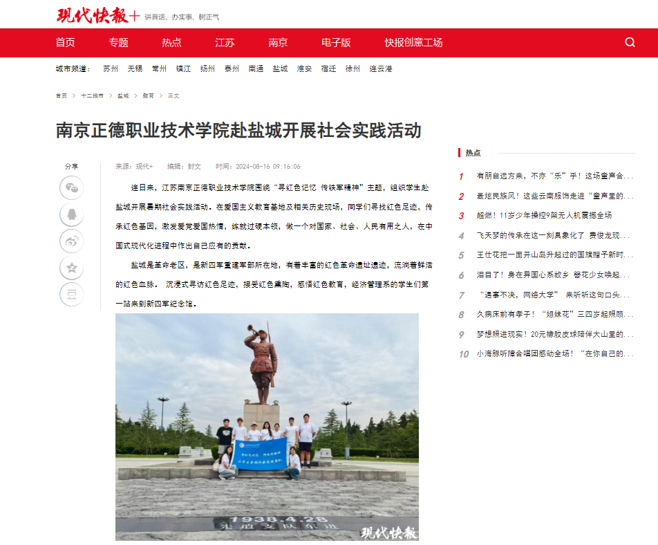 为更好学习和贯彻习近平新时代中国特色社会主义思想和党的二十大精神,引导和帮助青年学生在社会实践中“受教育、长才干、作贡献”。暑期经济管理系“寻红色记忆传铁军精神”实践小分队走进盐城,通过“打卡”新四军纪念馆、盐城革命陈列馆等地,重温先烈们的革命故事,深入学习新四军铁军精神,铭记历史中的“红色印记”。