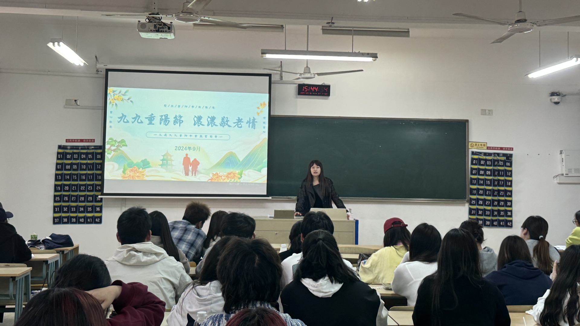 班会伊始,辅导员呙竹云通过生动的讲解和丰富的图片展示,向同学们介绍了重阳节的由来、节日习俗以及其在中华民族传统文化中的重要地位。她强调,重阳节不仅是登高望远、赏菊品糕的节日,更是全社会共同传承和弘扬尊老敬老美德的重要时刻。通过呙竹云的讲解,同学们对重阳节有了更加深入的了解,对尊老敬老的传统美德也有了更加深刻的认识。