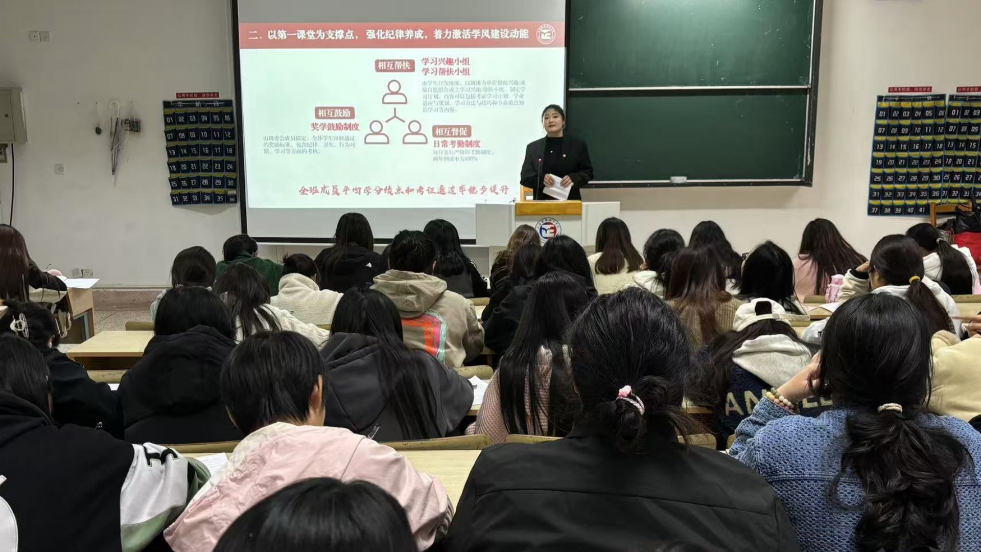 她的分享赢得了在场师生的阵阵掌声。她还特别提到了班级在面对困难和挑战时的团结互助精神,以及如何通过定期的自我反思和总结来不断提升班级整体的学习水平。她鼓励在座的学生们,要勇于面对学习中的挑战,不断探索适合自己的学习方法,同时也要注重团队合作,共同进步。分享会的答疑环节,她还回答了同学们关于学习方法和时间管理等方面的提问,现场气氛热烈,交流颇深。