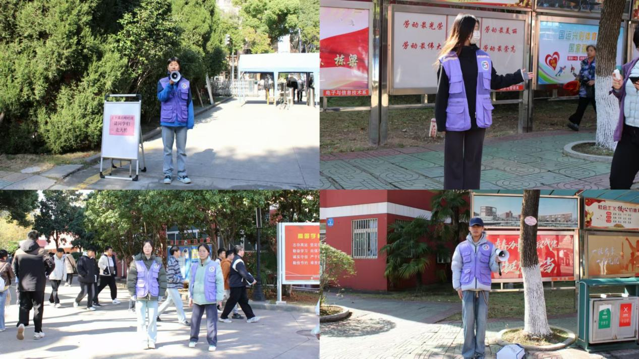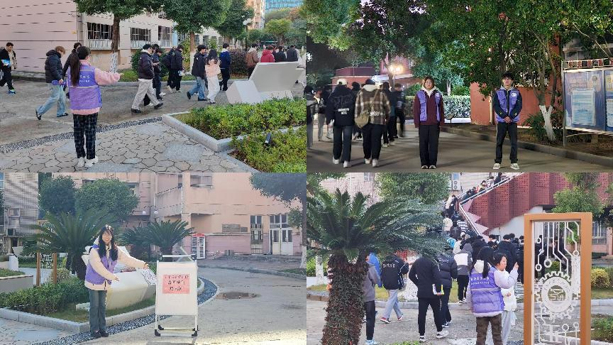 活动当天,16名身着紫色马甲的经管青年被精心分配到校园内四个人流量最为密集的时间段,在人流量密集的区域进行引导。他们肩负着在天桥及附近区域进行不间断巡逻的重任,以确保学生们能够安全、有序地通行。