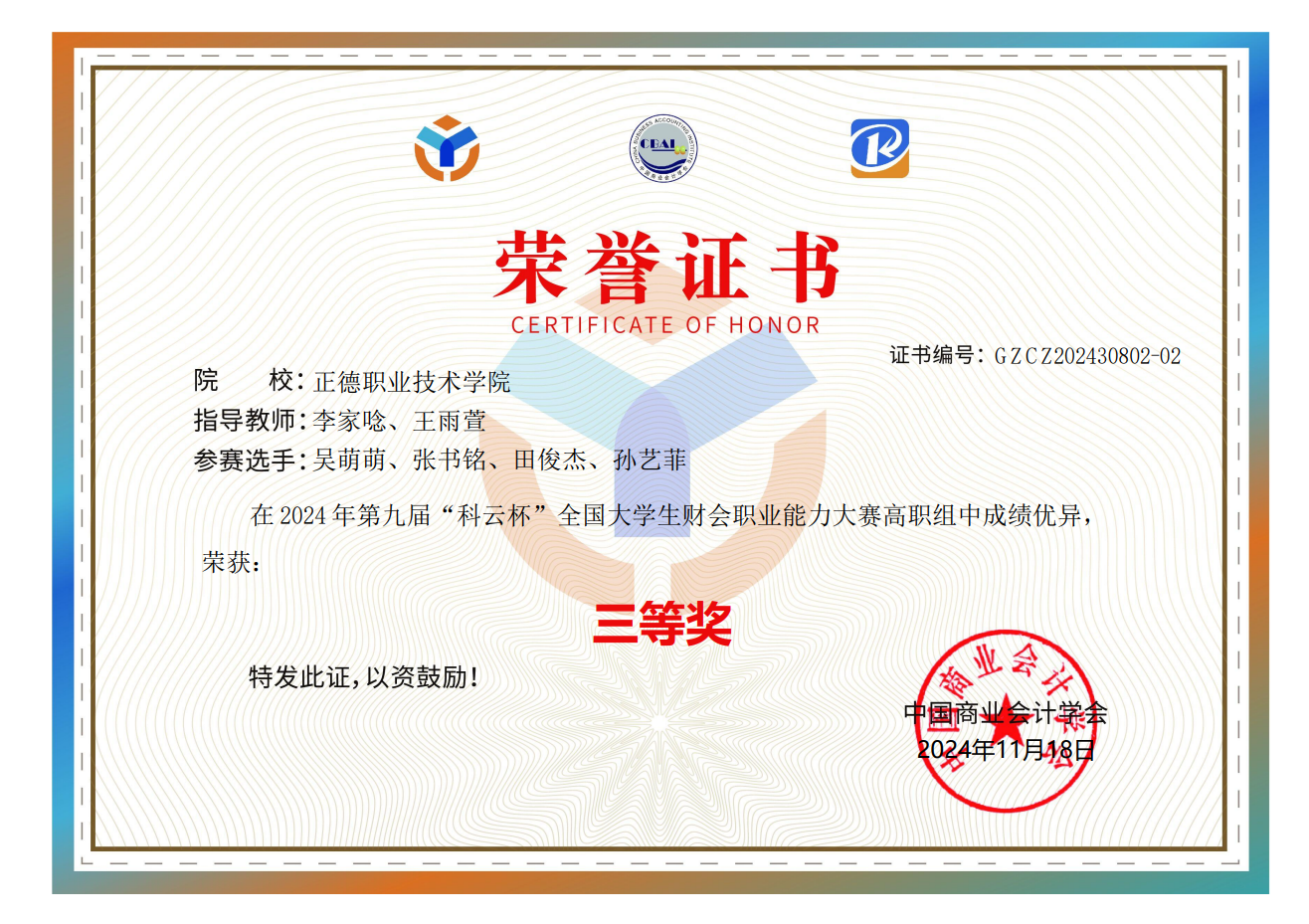 第九届“科云杯”全国大学生财会职业能力大赛于2024年10月26日(省赛)和2024年11月9日(国赛)圆满落幕。本次大赛中,我系学生分别获得三等奖,为我院争得了宝贵荣誉。