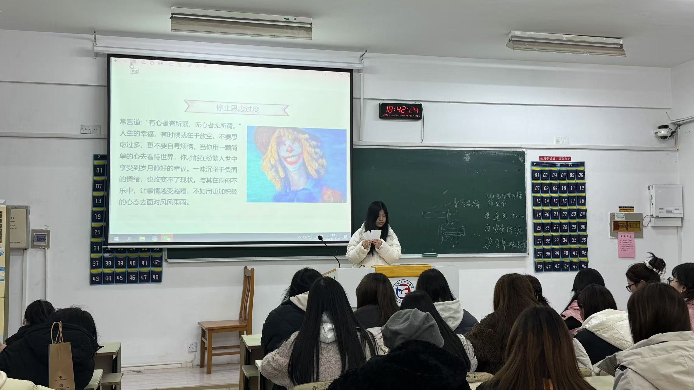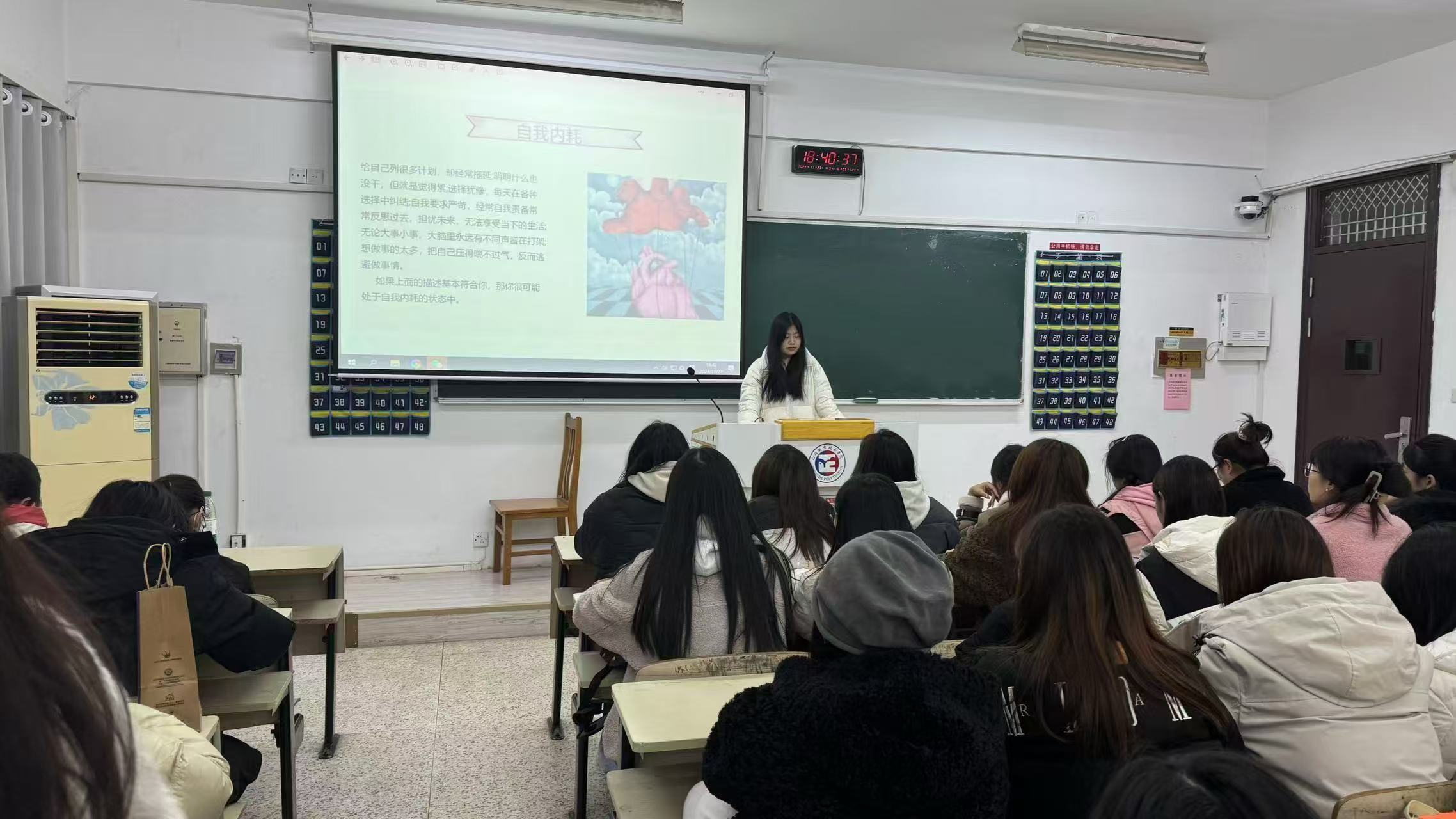 活动伊始,韩子怡首先通过PPT讲解了当代大学生普遍面临的自我内耗现象,从学业压力、人际关系到未来规划等多个方面进行了剖析。随后,进入活动的核心环节——心声漂流。同学们被鼓励将近期遇到的压力、困惑或快乐等情绪写在彩色纸条上,并匿名投入准备好的箱子中。韩子怡逐一抽取纸条,以温暖的话语对每一种情绪进行了反馈和调节,引导同学们正视自己的情感,学会合理表达和释放。在韩子怡的带领下,大家纷纷打开心扉,互相讨论起各自的经历和感受,彼此间传递着正能量与鼓励,整个教室充满了温暖和支持的氛围,有效帮助同学们释放了内心的压力。