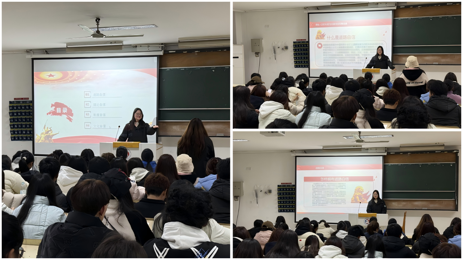 班会上,毛玉涵首先向同学们阐述了“四个自信”即道路自信、理论自信、制度自信、文化自信的深刻内涵和重要意义,接着通过案例和详实的数据展示了中国在经济、科技、文化等各个领域取得的辉煌成就,引导同学们深刻认识到中国特色社会主义道路的正确性和优越性。随后毛玉涵又从历史和现实的角度出发,详细阐述了中国特色社会主义道路、理论、制度、文化的独特优势和强大生命力,鼓励同学们作为新时代的大学生,应当深刻理解并积极践行“四个自信”,将其融入到日常学习和生活中,为实现中华民族伟大复兴的中国梦贡献青春力量。