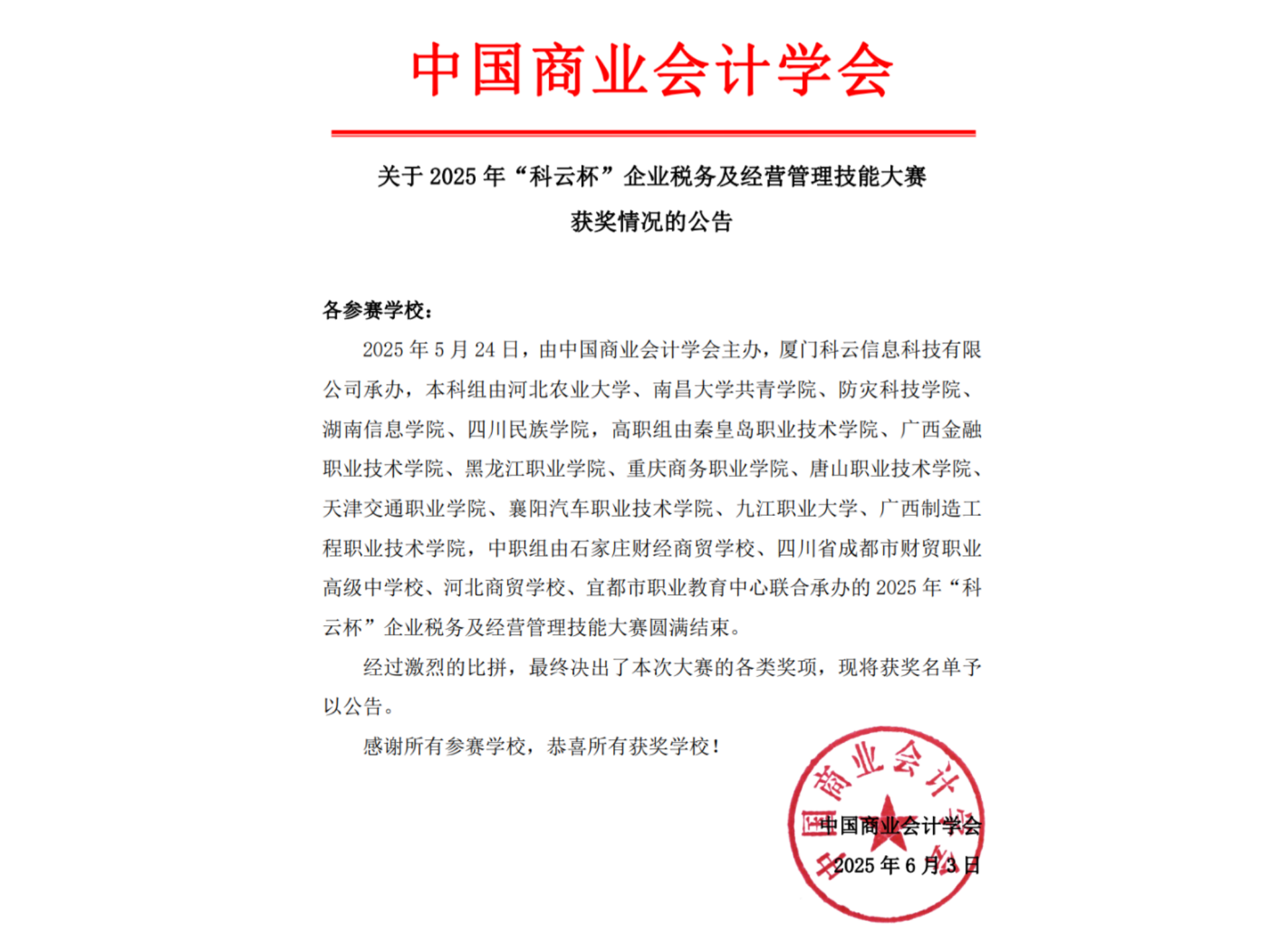 2025年“科云杯”企业税务及经营管理技能大赛由中国商业会计学会主办,比赛涵盖税务技能竞赛和管理会计技能竞赛两大环节,重点考察参赛团队在税收法律法规及管理会计实务方面的综合运用能力。此次大赛吸引了全国658支高等职业院校的参赛队伍,比赛难度大、覆盖面广,涉及多个财务岗位的专业技能,对选手的专业知识和团队协作能力都提出了极高要求。通过参与此次比赛,能够有效检验教学改革成果,推动相关专业教学改革的深入开展。