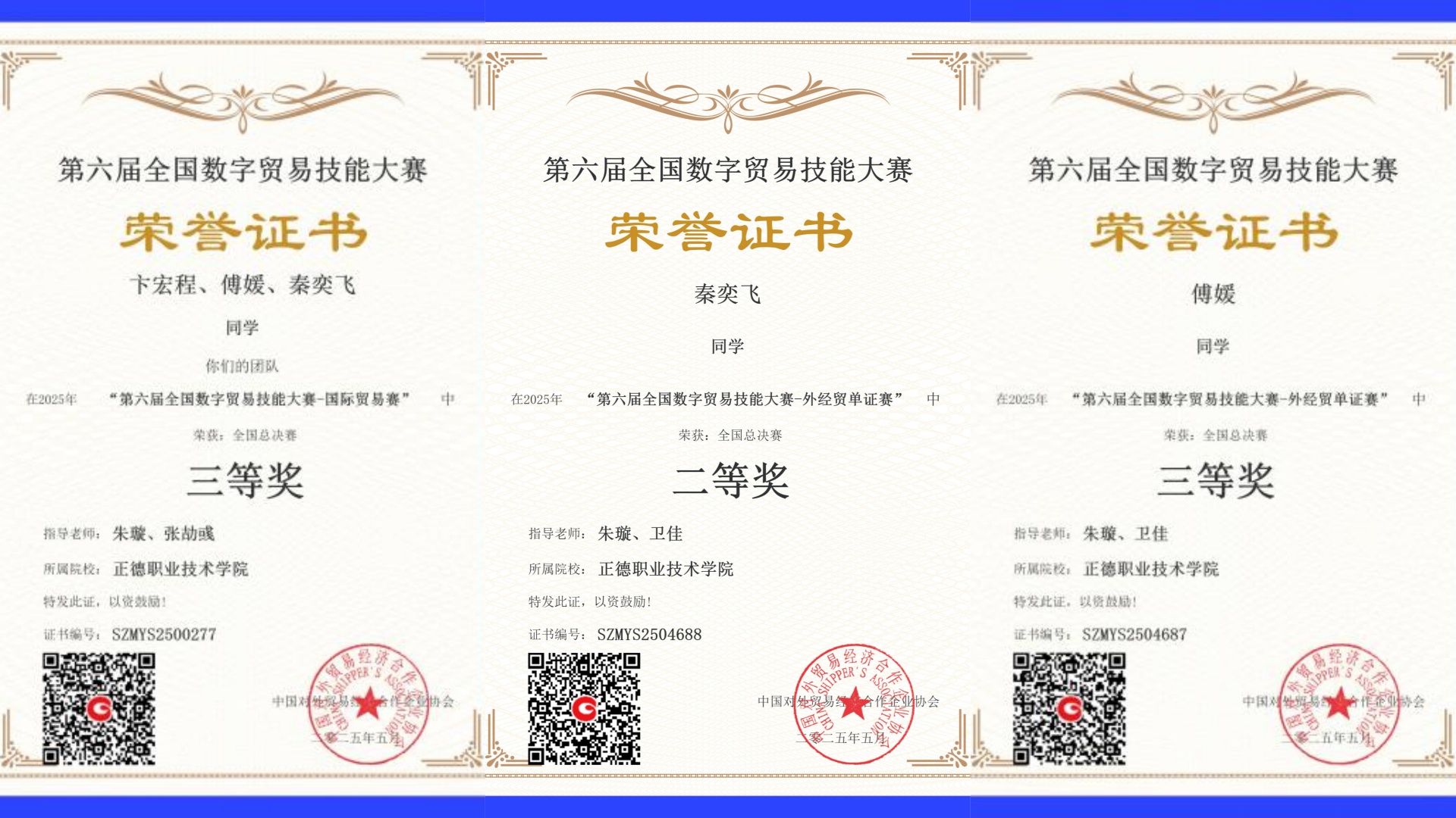 继去年首次参加全国数字贸易技能大赛后,国际经济与贸易专业在近日刚刚结束的第六届全国数字贸易技能大赛两个赛项中再获佳绩。其中国际贸易赛项为团队赛,243601班卞宏程、傅媛、秦奕飞组成的参赛队经过5天(2025年5月13日-5月17日)激烈的线上角逐,在高职组449个参赛队中脱颖而出,荣获三等奖。5月24日举行的外经贸单证赛项个人赛中,卞宏程、傅媛、秦奕飞三位同学继续迎接挑战,最终秦奕飞荣获二等奖。