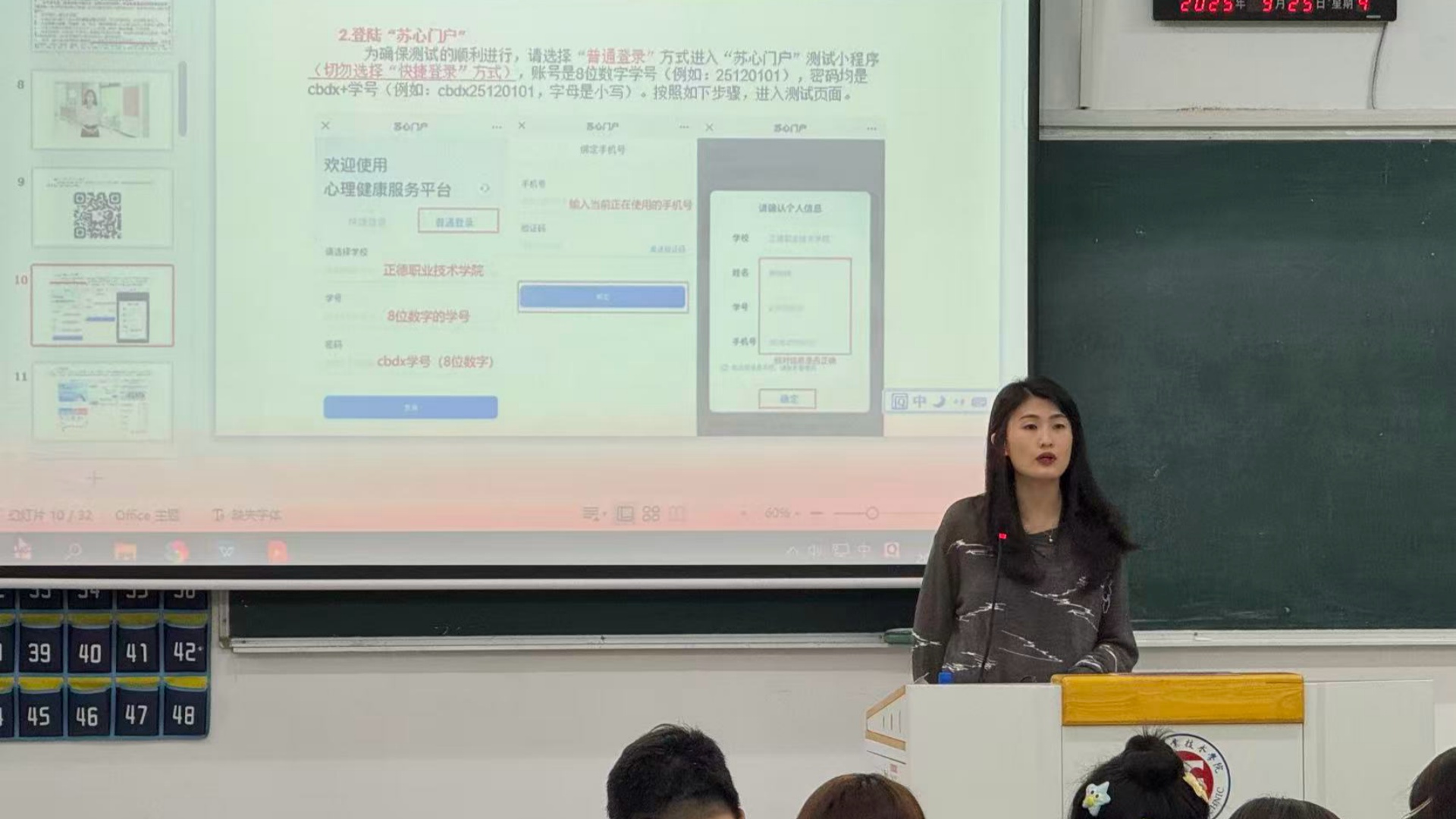此次心理普测由学生处统筹组织,特邀学校心理健康教育中心教师提供专业指导。测试前,辅导员廖老师通过 PPT 演示和现场讲解,详细介绍了心理普测的目的、流程及注意事项,强调测试结果仅用于心理健康服务,消除新生对个人信息保密的顾虑。同时,针对测试系统的操作步骤进行现场演示,确保每位新生都能熟练掌握答题方法。