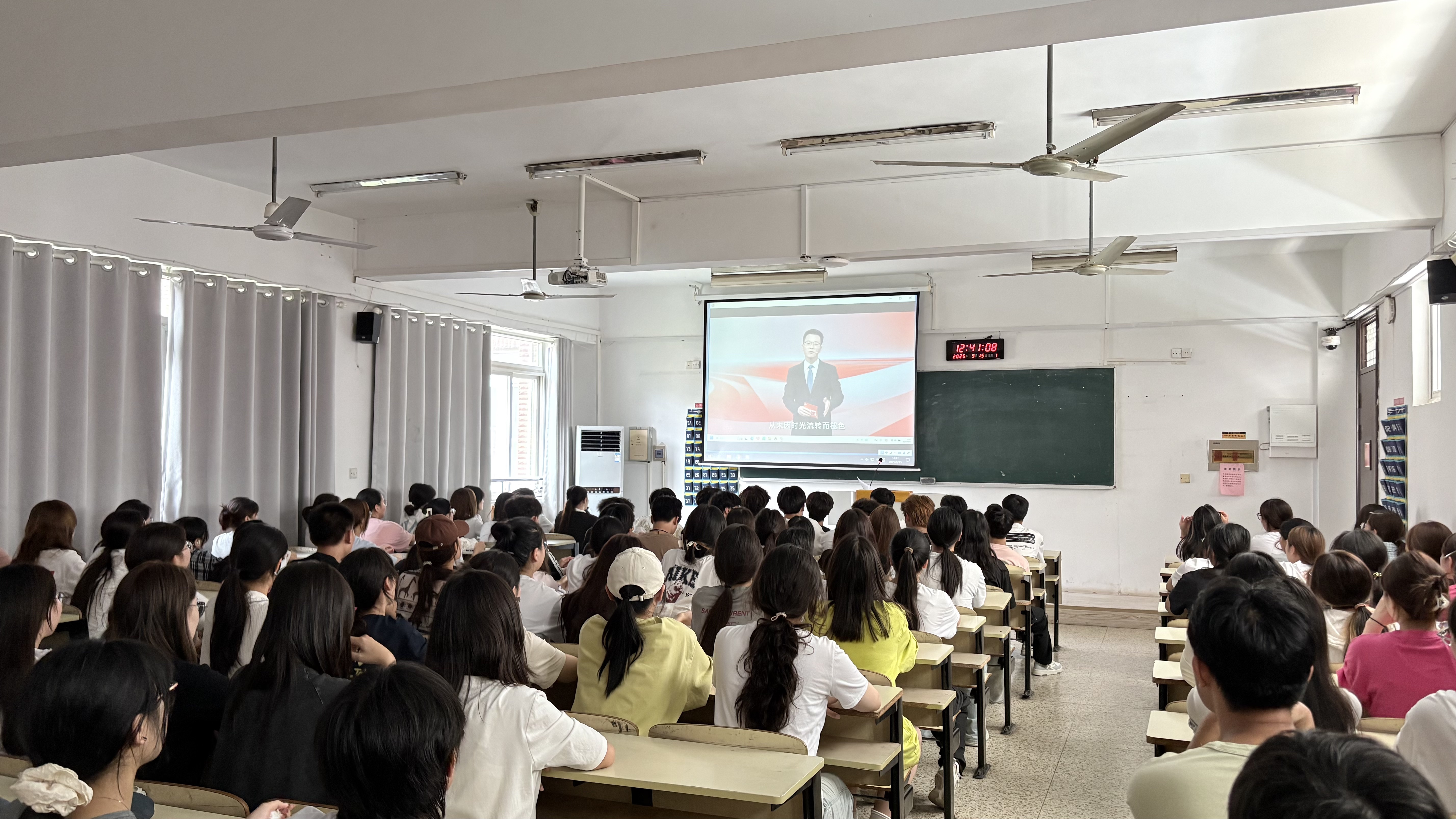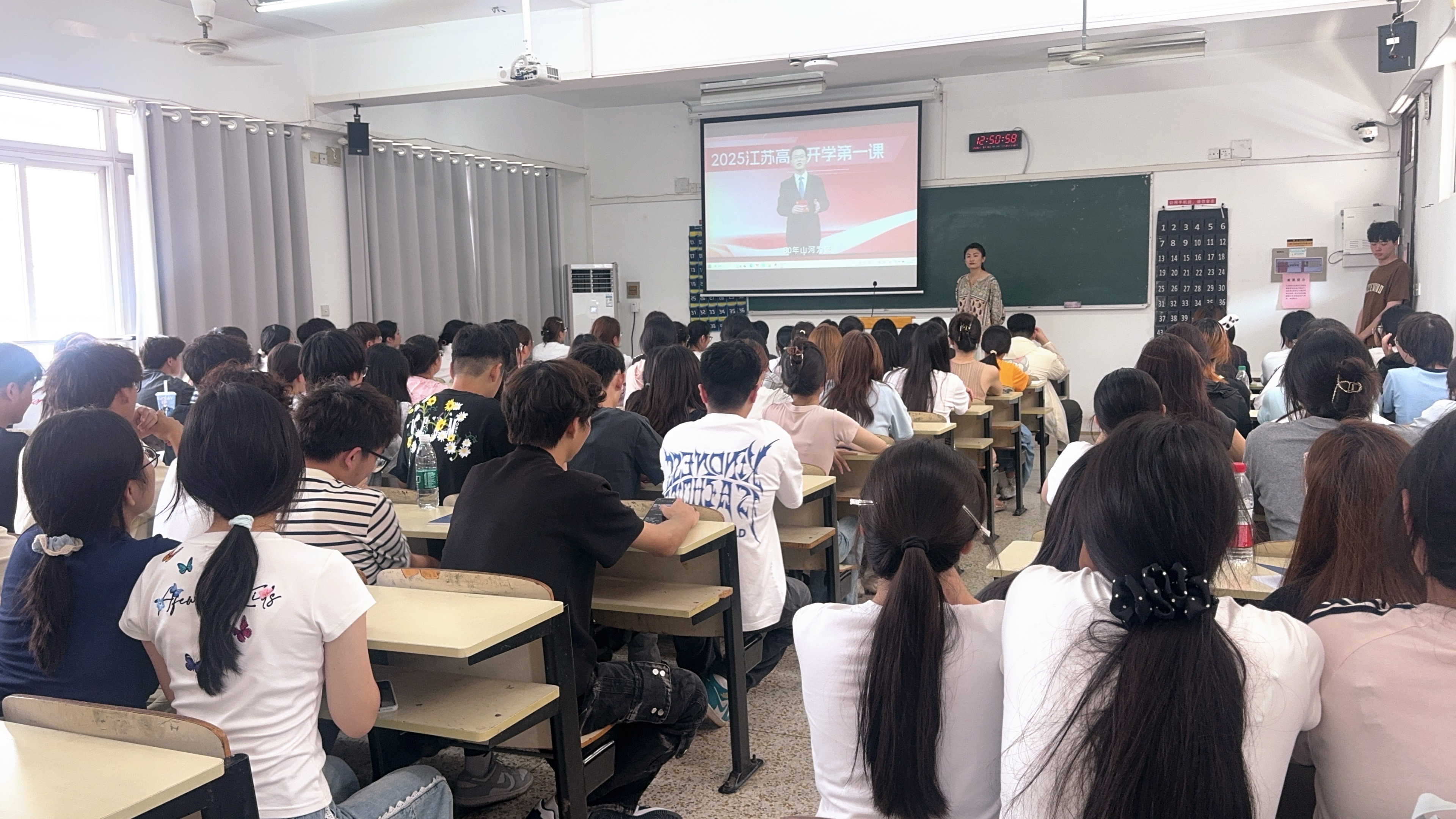 9月15日上午,经济与管理系组织全体大一师生集中收看了2025年江苏高校“开学第一课”,他们齐聚各教室、会议室,通过大屏幕同步聆听“青春与祖国同行”主题课程,从在真实的故事中感悟青年使命、坚定理想信念。