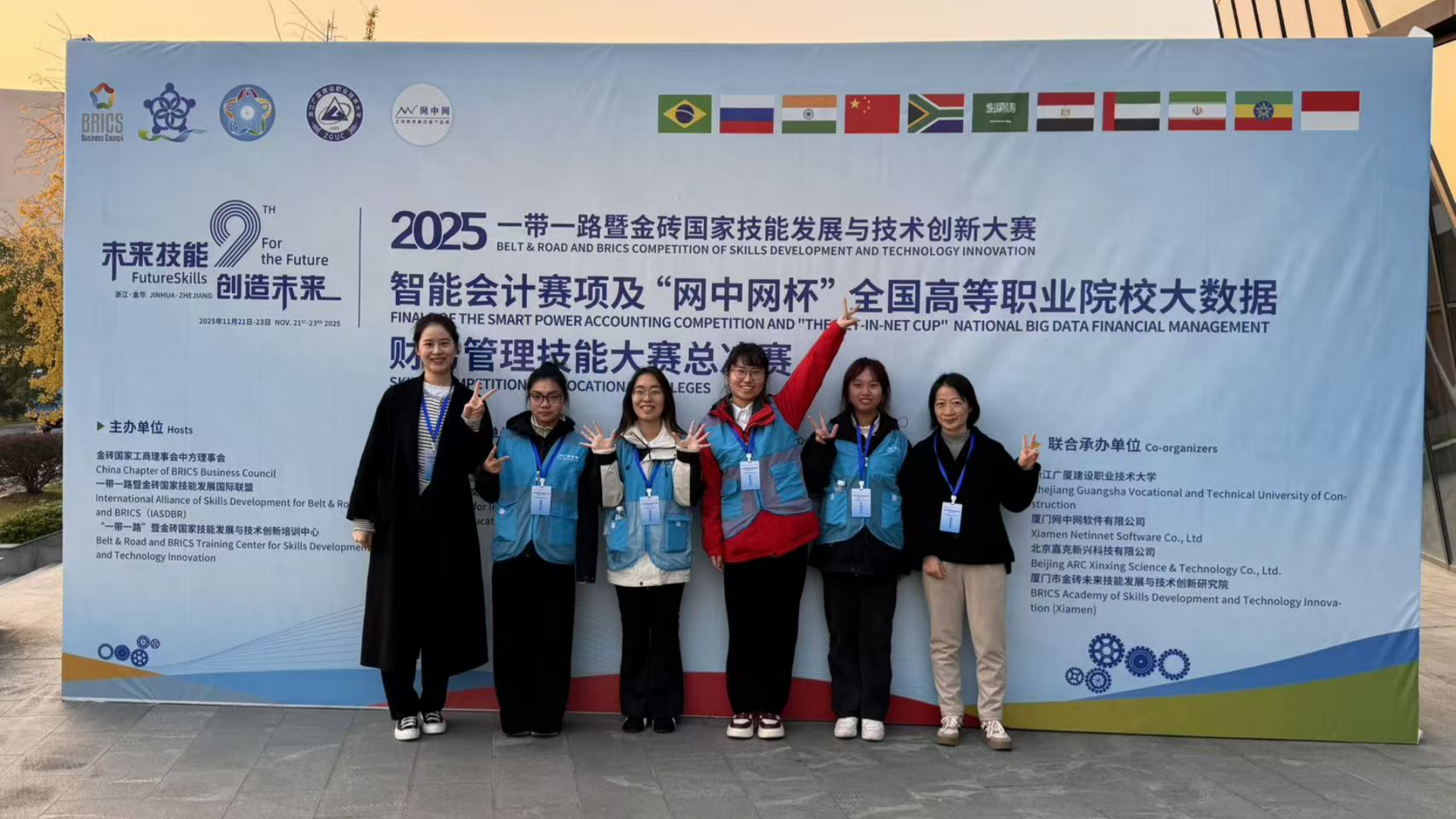11月23日,我院经济与管理系在2025年一带一路暨金砖国家技能发展与技术创新大赛智能会计赛项全国总决赛中传来喜讯,由李家唸、王黎娜老师指导,吴雨轩、周言之、彭安琪、于童淼组成的代表队,凭借扎实的专业知识和默契的团队合作,荣获全国总决赛团队二等奖。同时,学院荣获“优秀组织奖”,这充分展示了学院在大数据财务管理、智能会计领域人才培养方面的实力。