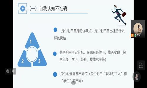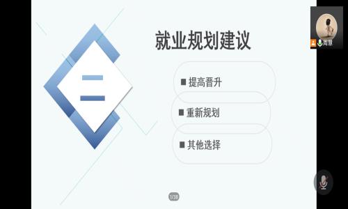 进而,周慧引导学生在自我总结的基础上找到自己以后的发展方向,是职业晋升、重新规划还是进行其他选择。在三类选择的抉择上,周慧也提出了具体的步骤、要求和注意事项,而不是简单的就业套路,帮助同学们有效地进行分析和归纳,指导学生根据自身找出最适合的发展之路。