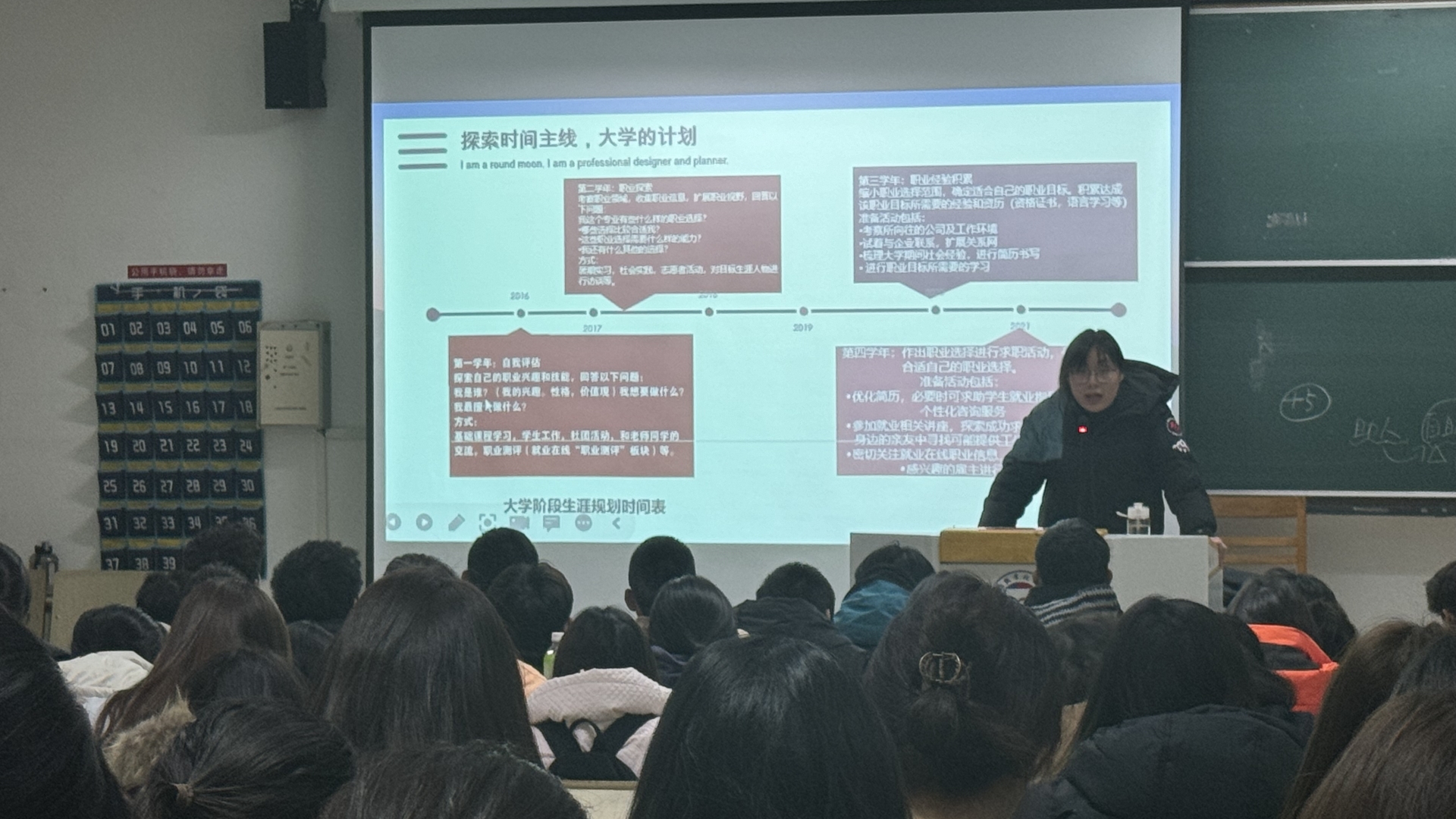 接着,刘妍从毕业生反观生涯问题,展示出一系列发人深省的例子,如“我学了4年的本专业,但我发现我完全没兴趣,我根本不想从事本专业的工作,可我又没有别的技能。”、“我想要的工作不一定要我,这个单位虽然不是我想去的,但先留个保底再说。”等等,进而提问“这些问题是在毕业时才出现的吗?”同学们陷入了沉思,对自己的职业规划产生疑惑。