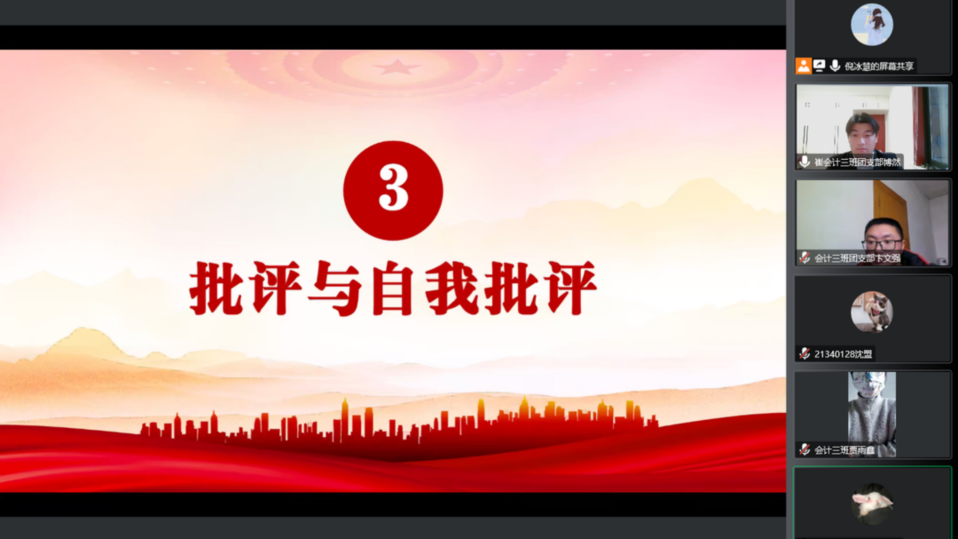 为深入学习贯彻党的二十大精神,推动党的二十大精神在基层团支部落地生根,紧密结合团员学习与生活实际,开好开实基层团支部组织生活会,教育引导广大团员学会批评与自我批评、反思与自我成长,厚植爱党爱国情感,争当中华民族伟大复兴的生力军,12月15日,在经济与管理系团总支的指导下,223303团支部于腾讯会议线上举行“学习二十大 永远跟党走 奋进新征程”专题组织生活会。经管系团总支书记倪冰慧老师,及大一全体团支部书记参加了本次会议。