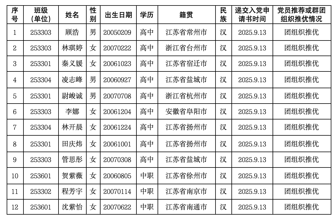 按照发展党员工作有关规定,根据群团组织推优情况,经支部委员会2026年3月12日研究,确定顾浩、林琪婷等35位同志为入党积极分子。公示时间为:2026年3月12日-3月18日。对公示对象如有异议,请于公示期间与经济与管理系党支部联系。联系电话(传真):025-52111905;信箱:917072807@qq.com。