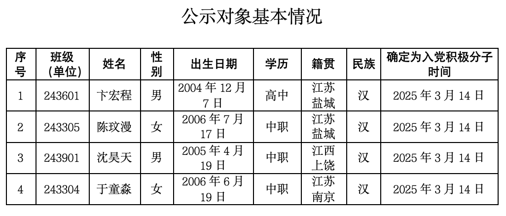 经党支部培养教育和考察,在听取党小组、培养联系人、党员和群众意见的基础上,经支委会2026年3月25日讨论,拟确定卞宏程、陈玟漫、沈昊天、于童淼4位同志为发展对象。根据发展党员工作有关要求,现将其有关情况予以公示(见附件)。