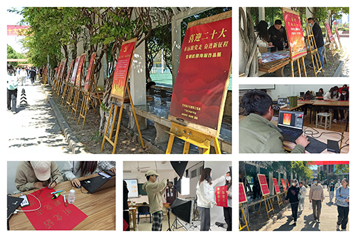 近日,学院紫藤长廊旁迎来了一场以党的“二十大”为主题的校园文化海报剪纸展,这是艺建系学子结合专业技能来庆祝党的二十大胜利召开,用作品表达“听党话、跟党走”的爱国情怀。