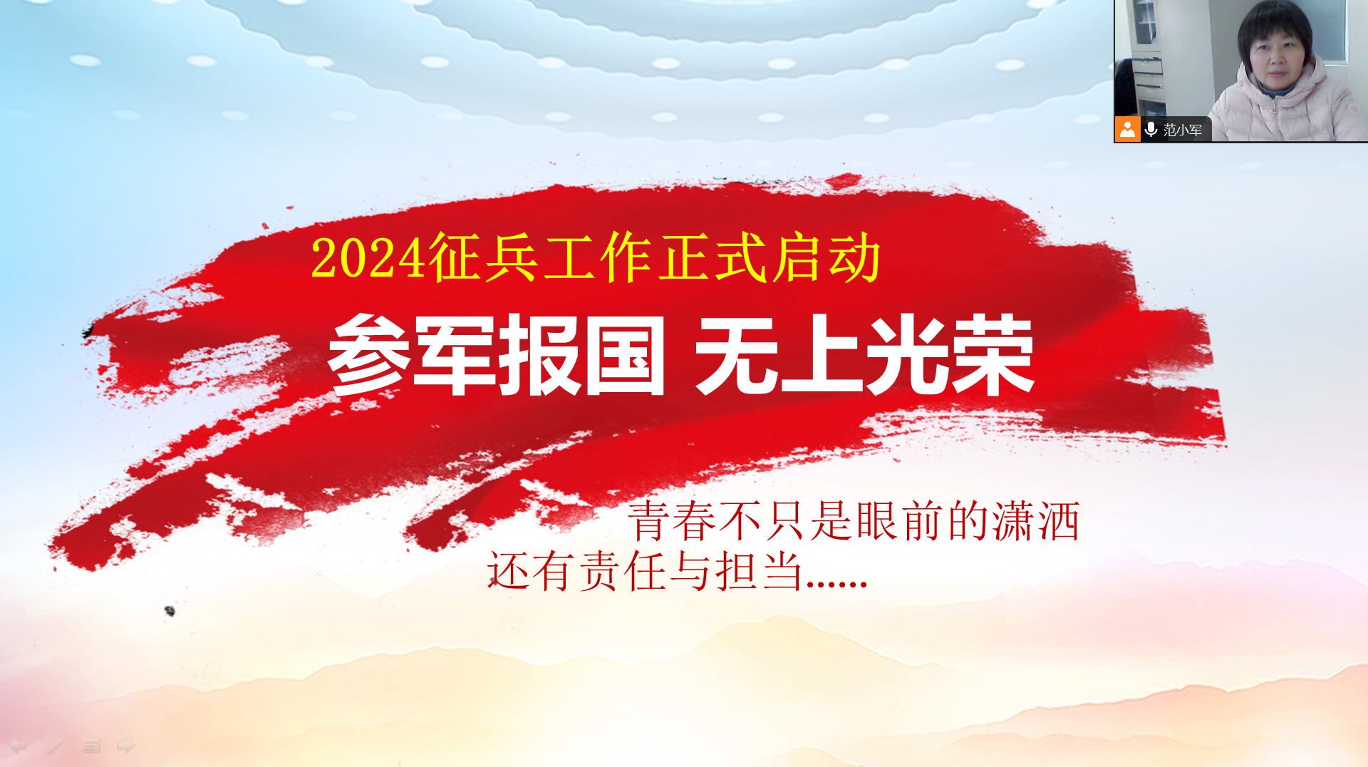 热血青年,携笔从容,投身国防,报效祖国。为进一步做好征兵政策宣传,有效激发青年大学生参军入伍的积极性,推动国防和军队现代化建设。2023年12月11日艺术设计与建筑工程系在线上召开征兵入伍宣传活动,由辅导员范小军老师宣讲,2021级全体学生参加会议。