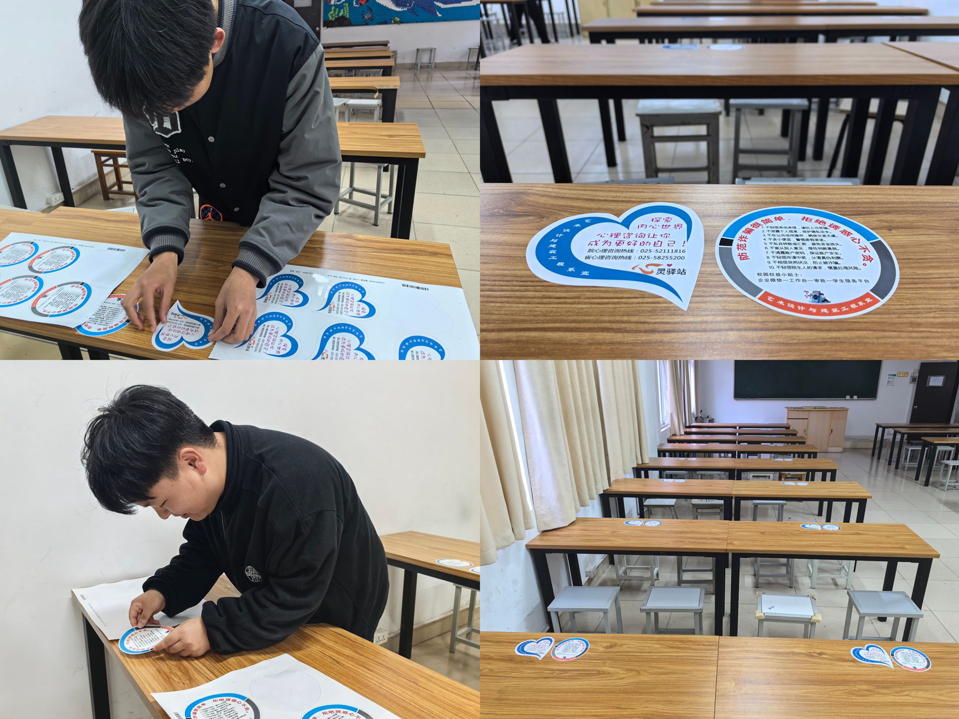 此外,为更好地让安全防诈意识以及权益维护意识深入学生生活,辅导员组织学生在8号教学楼,将反诈宣传标语以及省、校两级的心理热线、校内学生权益通道贴上了课桌,让学生在日常生活中随时看到并接受这些信息,从而增加他们对反诈知识的了解和掌握,同时也为他们提供了一个寻求心理帮助、解决生活诉求的途径。