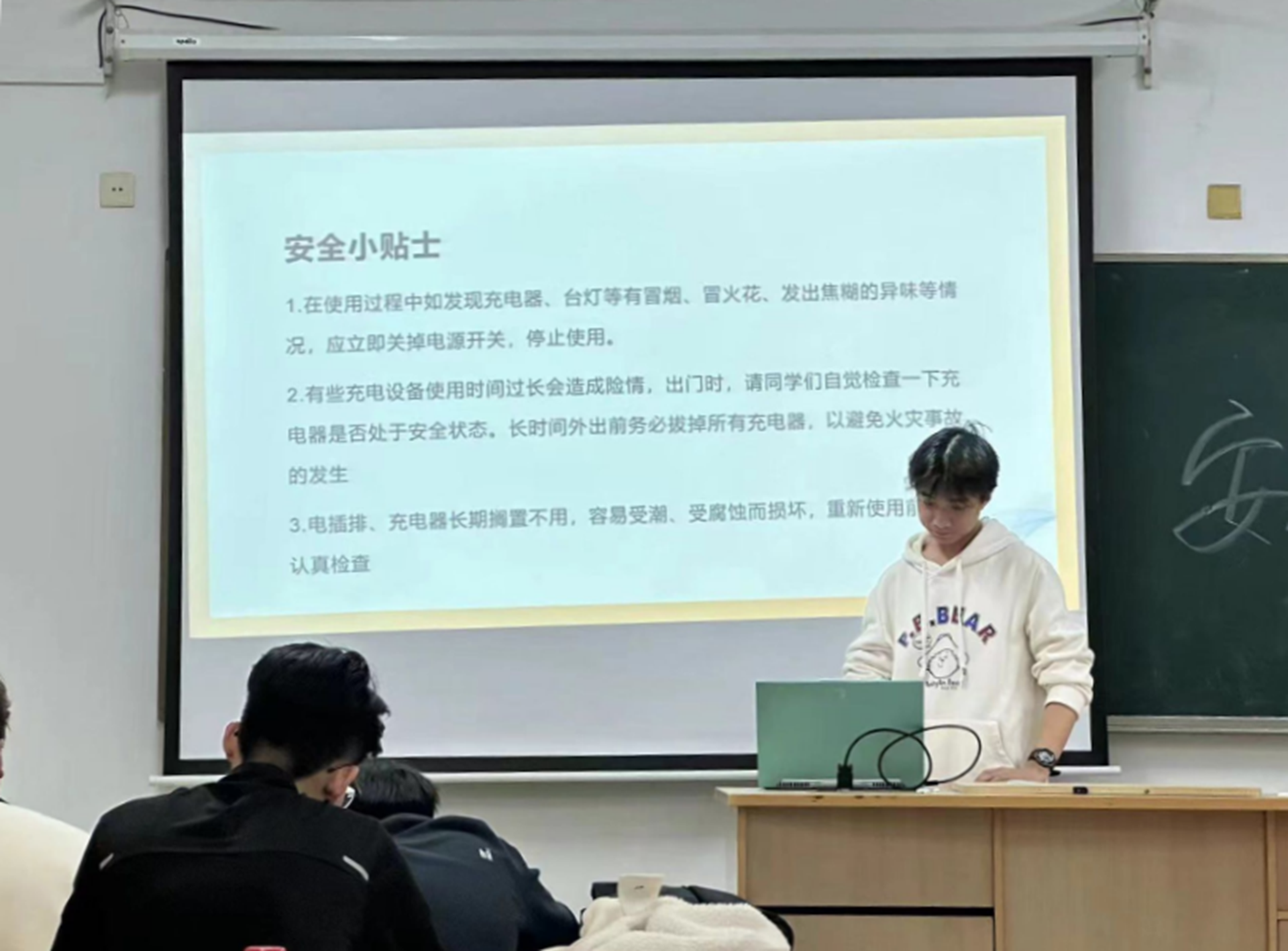 23级环境艺术设计与建筑装饰工程技术专业的学生举办了“安全教育”主题活动。在活动中,严重九同学详细讲解了宿舍用水用电的安全知识,并通过展示图片、短视频以及无锡某职业院校因抽烟导致的宿舍火灾案例,深入剖析了宿舍内潜在的安全隐患,以此提醒同学们时刻绷紧安全这根弦,将安全意识内化于心、外化于行。