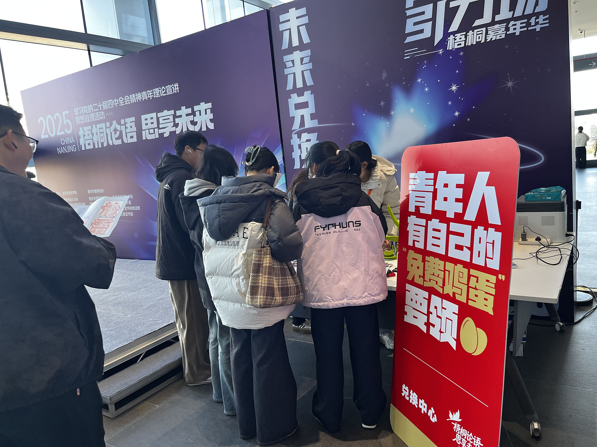 在“两创引力场”科创展区,同学们与全球首款防爆人形机器人“天魁1号”互动,体验江苏集萃咖啡机器人、南大电子“杜杜”智慧服务机器人,并用课堂所学的AIGC生成技巧现场为展商优化导览界面,收获点赞盖章与活动礼品。随后,大家聆听紫金山实验室、国家电网南瑞集团、天创智能等青年工程师讲述6G领跑、虚拟电厂、防爆人形机器人、垂直视频大模型背后的“十年磨一剑”故事,深刻体悟“科技自立自强”的青春担当。