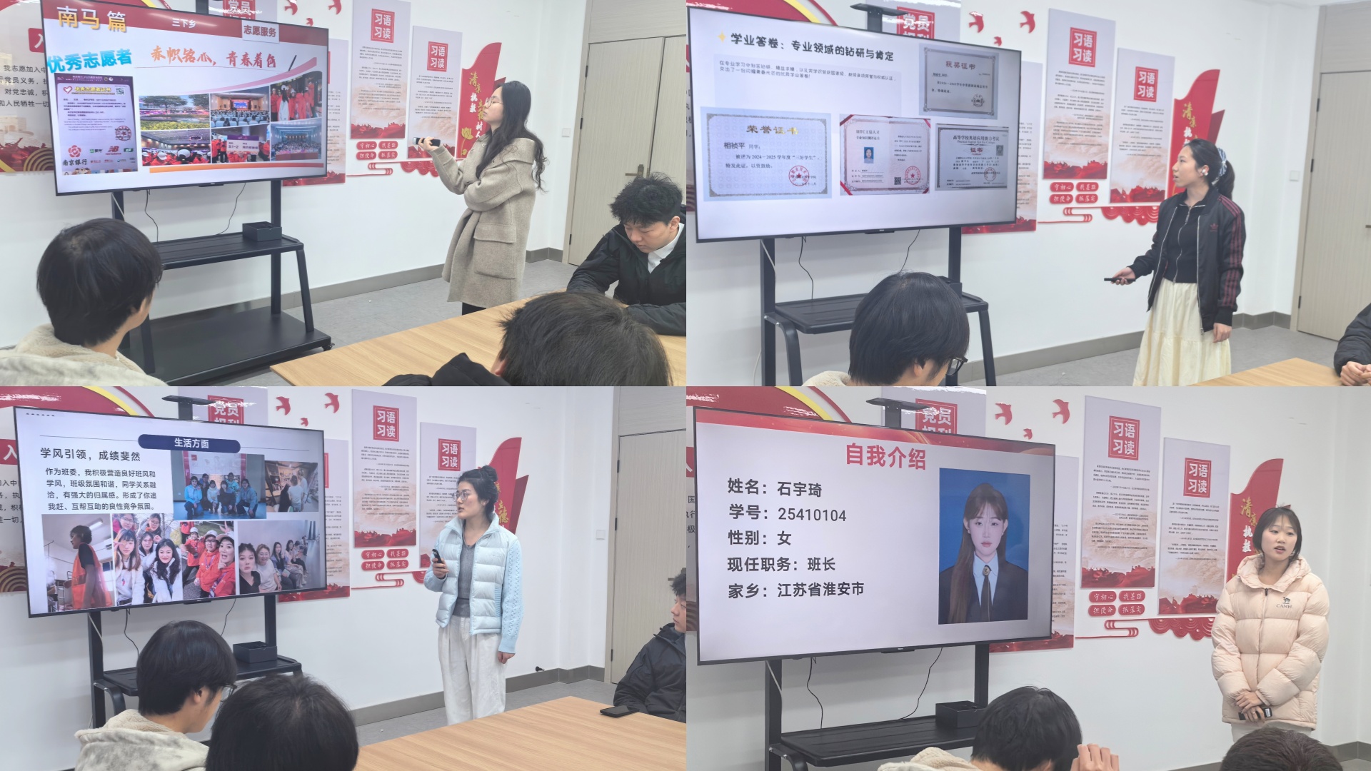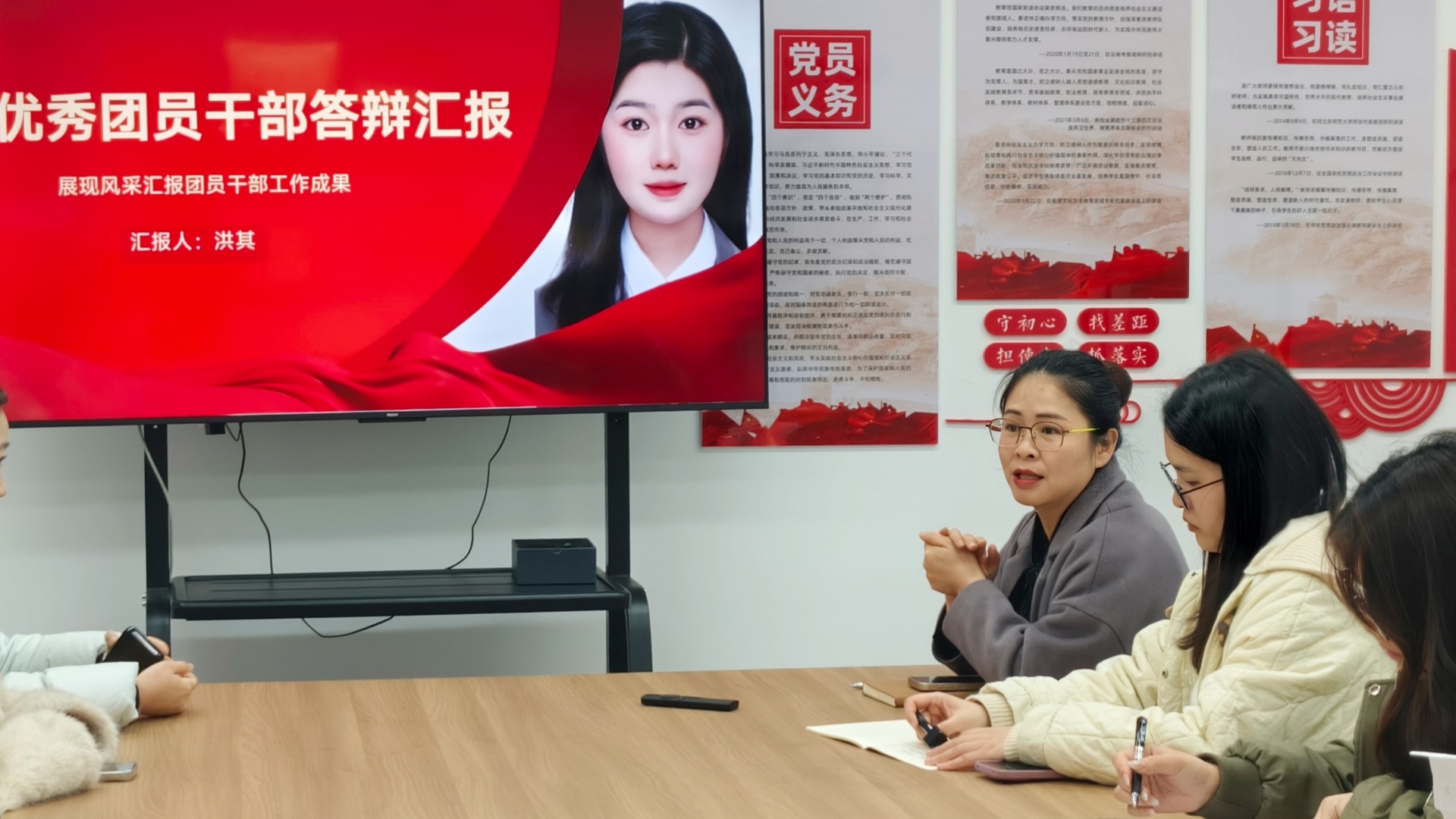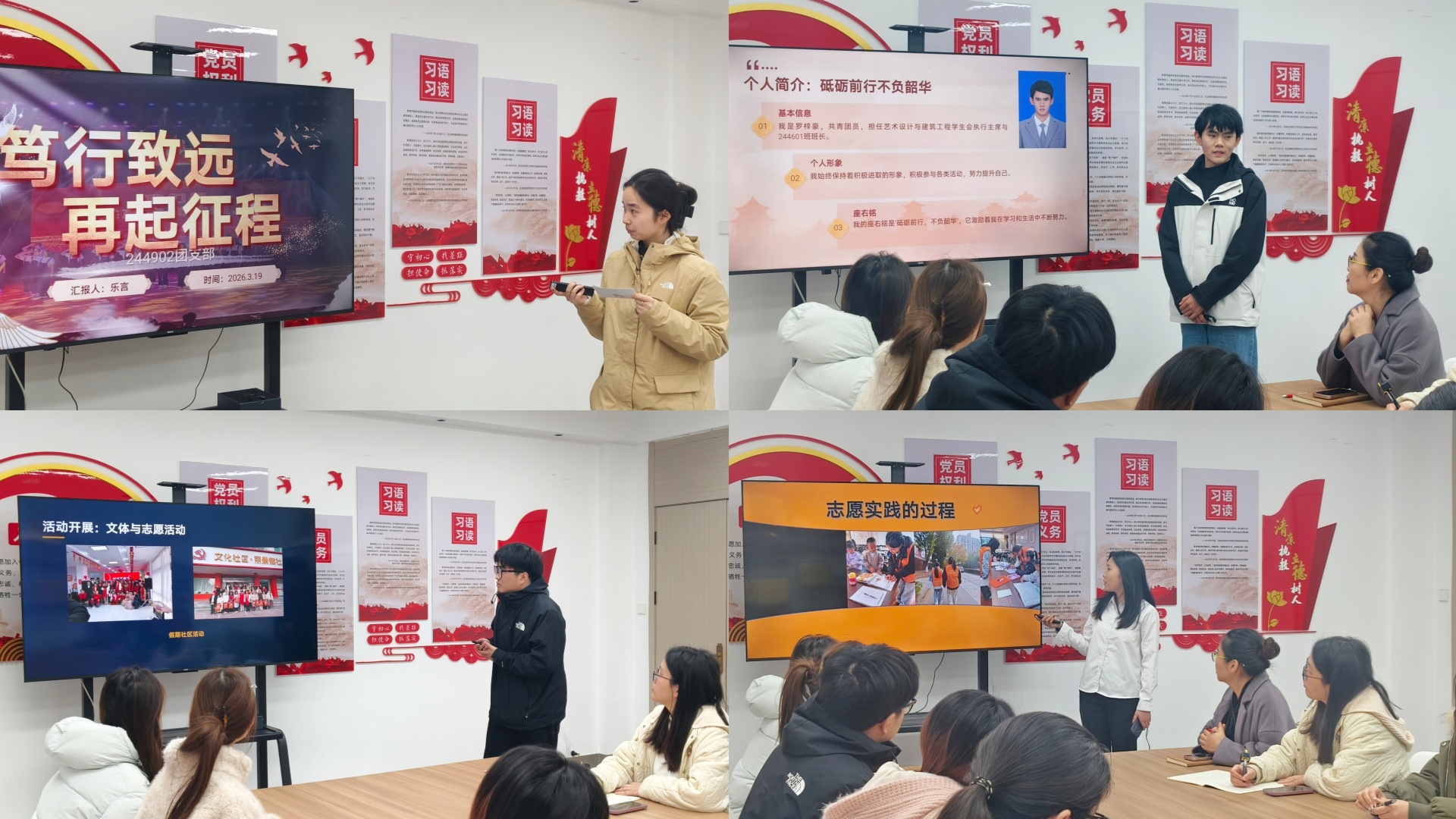 3月19日中午,在8号楼艺心之家开展了红旗团支部、优秀团干部和优秀团员标兵的答辩会。答辩现场,团员干部们精神饱满、意气风发。他们通过精心制作的PPT,结合翔实的数据、生动的案例和丰富的图片,全面且深入地展示了过去一年在团学工作中所取得的成果。从组织开展的各类丰富多彩的团日活动,到积极参与志愿服务为社会贡献力量;从带领团支部在学业上取得优异成绩,到在思想引领方面发挥的积极作用,每一个细节都彰显着他们的责任与担当。