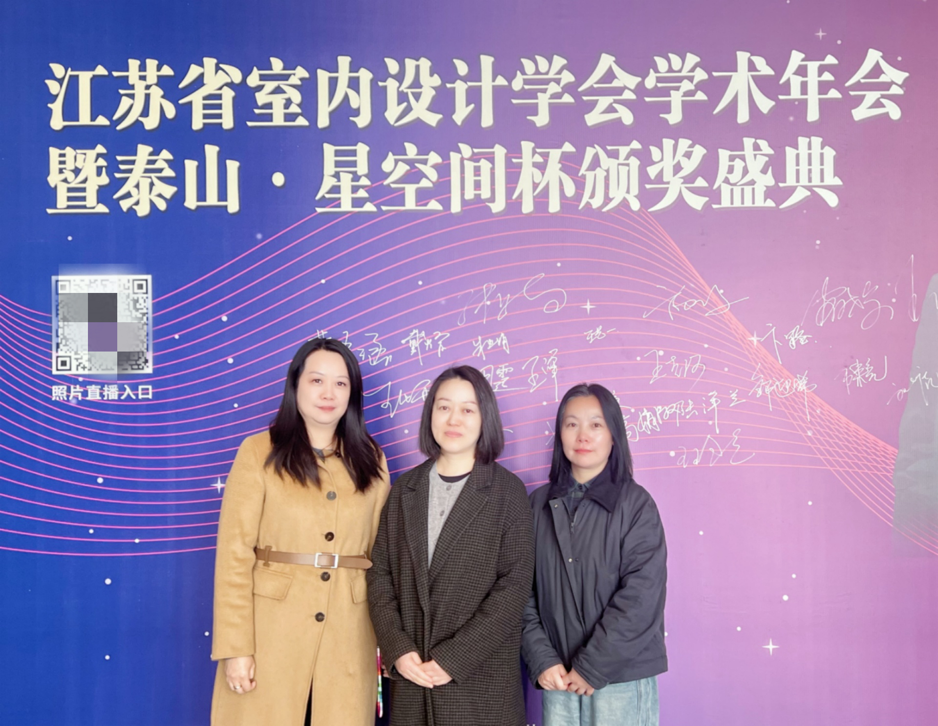 2026年3月21日,江苏省室内设计学会第16届“泰山·星空间杯”室内设计大奖赛颁奖典礼在南京隆重举行。本届大赛以生态与环保、节能与健康、城市更新、文化与传承、技术与创新为设计主题,由江苏省科学技术协会指导、江苏省室内设计学会主办,是入选江苏省高等教育学会《2025年全省普通高校本专科生学科竞赛省级赛事目录》的重要赛项。我院艺术设计与建筑工程系教师冯显静、周倩、刘丽三位教师应邀出席典礼,共同见证了这一行业盛事。
