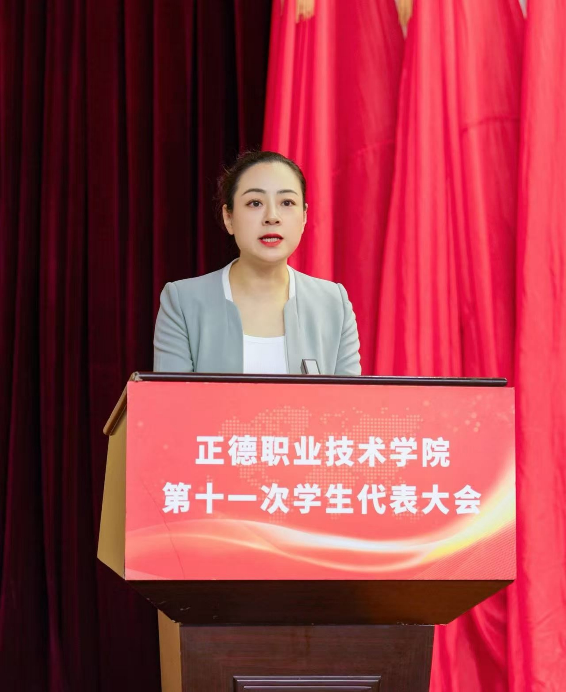 梁薇代表学院党委对本次学代会的召开表示祝贺,向长期以来关心支持我院学生会工作的省学联、兄弟院校表示感谢。她表示,在过去的一年里,我院学生会在院党委和省学联的正确领导下,在院团委的具体指导下,团结带领正德学子积极响应全国学联改革号召,坚持依法依章开展工作,在思想政治引领、校风学风建设、服务学生成长等方面展现了积极作为。同时提出三点希望:一是希望全院广大学生坚定理想信念,凝聚“与党同心”的青春共识。让坚定信念锤炼技能、铸就匠心报效祖国成为正德学子的亮丽名片;二是希望全院各级学生干部立足服务职能,夯实“挺膺担当”的工作基石。让敏行勤思争当先进、优良学风领航成长成为正德学生骨干的主流群像;三是希望全院各级学生会组织深化改革创新,锻造“跟党奋斗”的先进组织。让服务同学温暖相伴、桥梁纽带坚实可靠成为正德学生组织的直观印象。