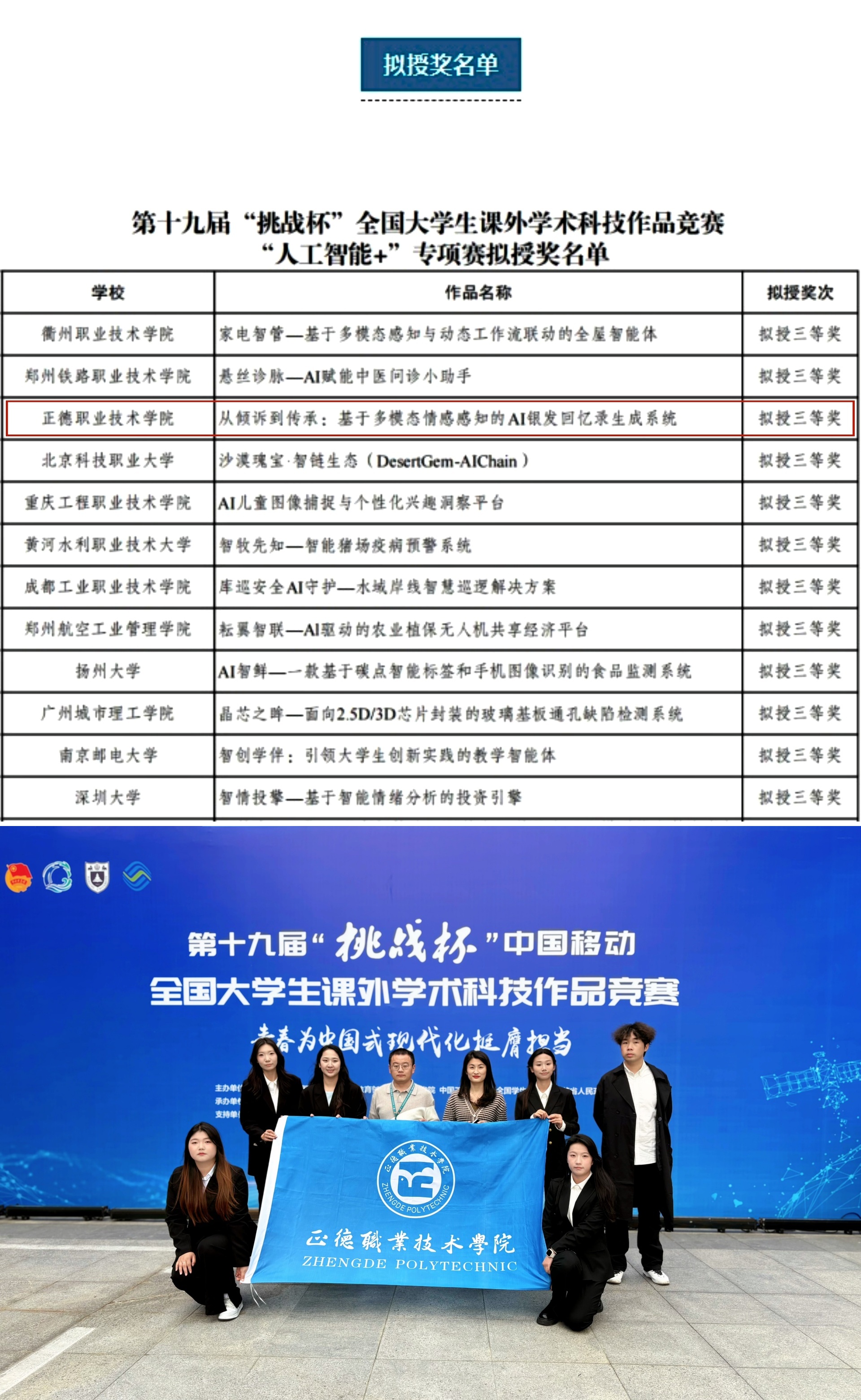 近日,由共青团中央、中国科学技术协会、教育部、中国社会科学院、中国工程院、中华全国学生联合会、江苏省人民政府主办的第十九届“挑战杯”全国大学生课外学术科技作品竞赛终审决赛在南京大学圆满收官。我院由倪冰慧、黄晓帆、廖晶晶三位教师指导,经济与管理系陈玟漫、卞宏程、石婷、陈清漪、姚甜甜五位同学为团队成员,完成的项目《从倾诉到传承:基于多模态情感感知的AI银发回忆录生成系统》荣获“人工智能+”专项赛国赛三等奖,实现了我院在“挑战杯”赛事上的历史突破!