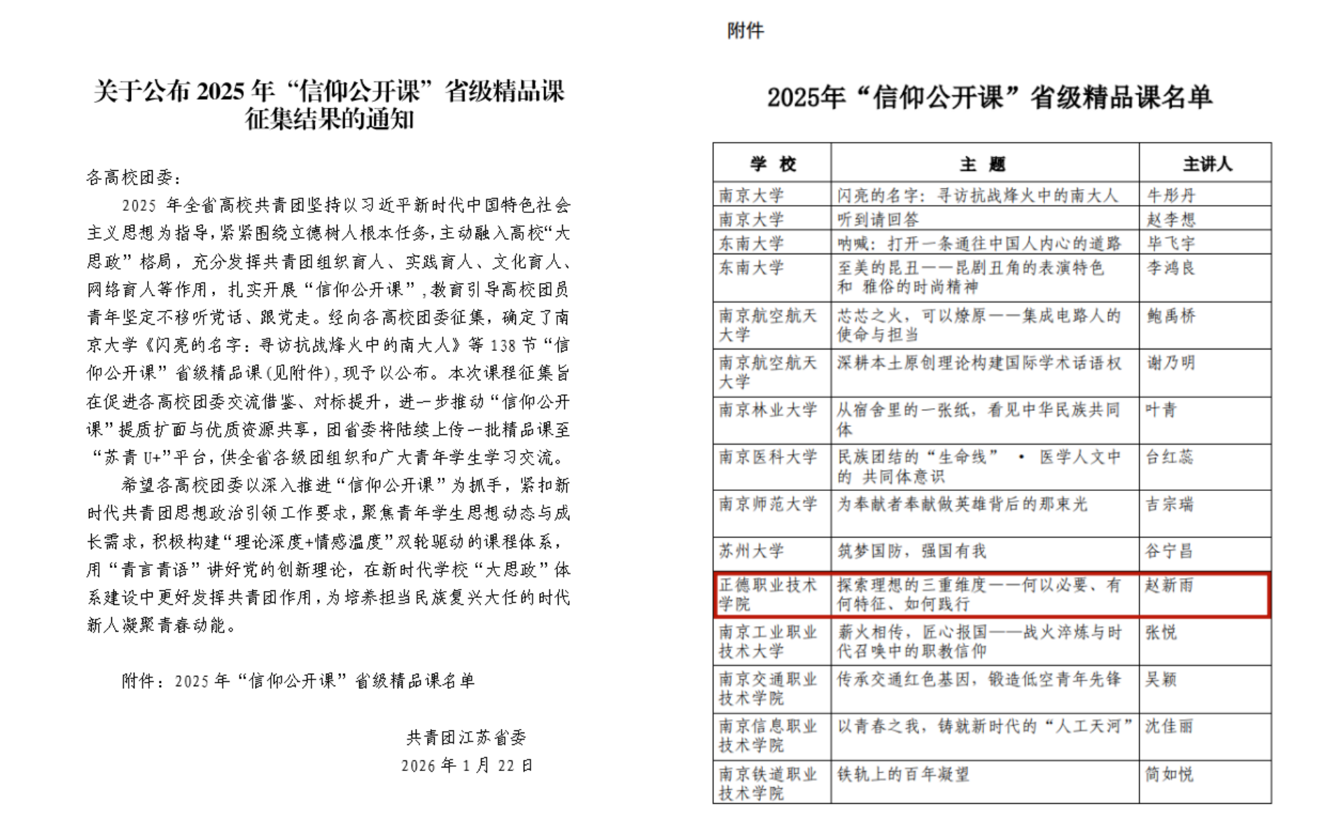 近日,共青团江苏省委正式发布了《关于公布2025年“信仰公开课”省级精品课名单的通知》。经过各高校团委的精心推荐和团省委的严格遴选,全省范围内共评选出138节“信仰公开课”入选“省级精品课”,我院提交的作品《探索理想的三重维度——何以必要、有何特征、如何践行》再次成功入选。