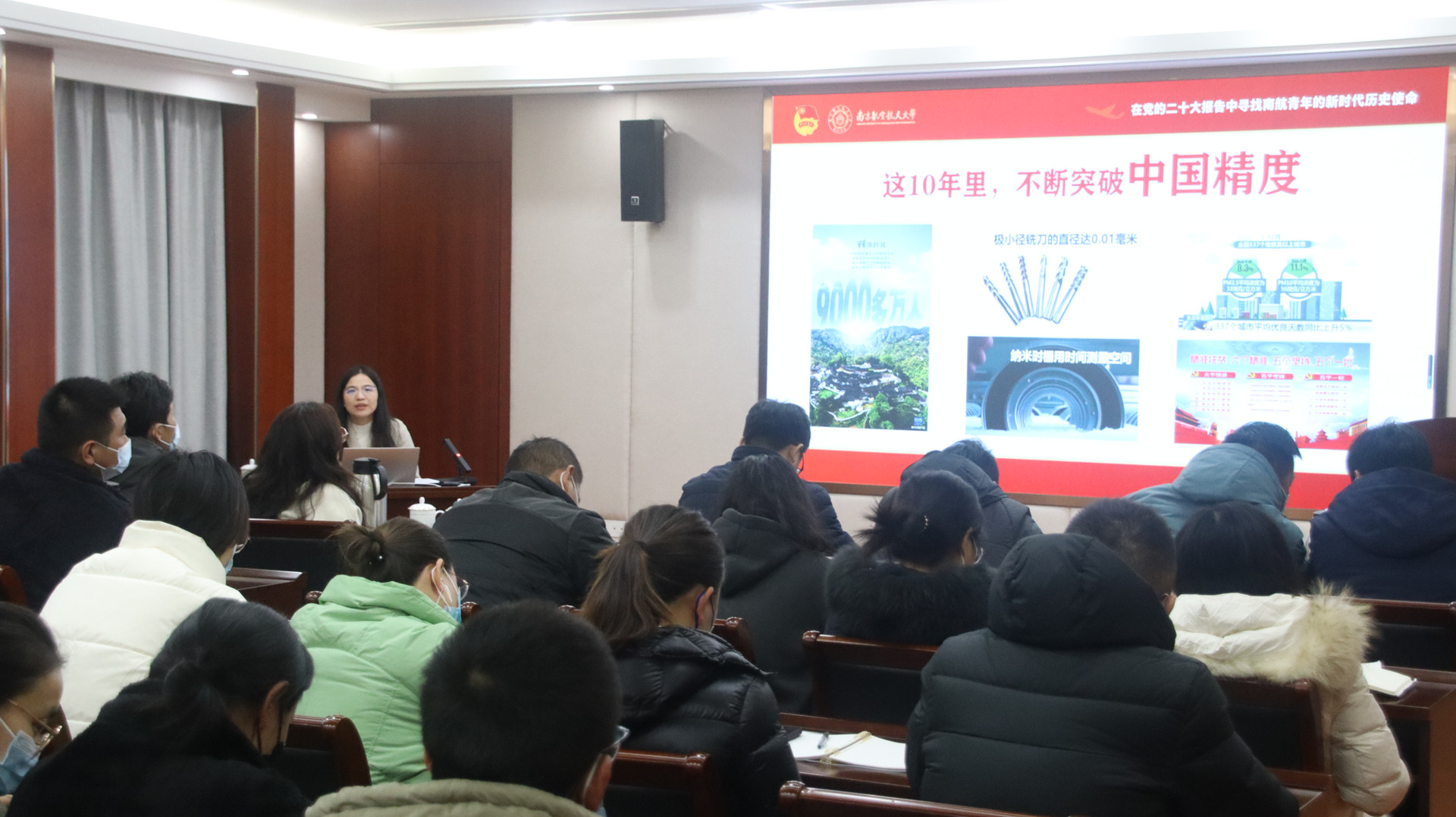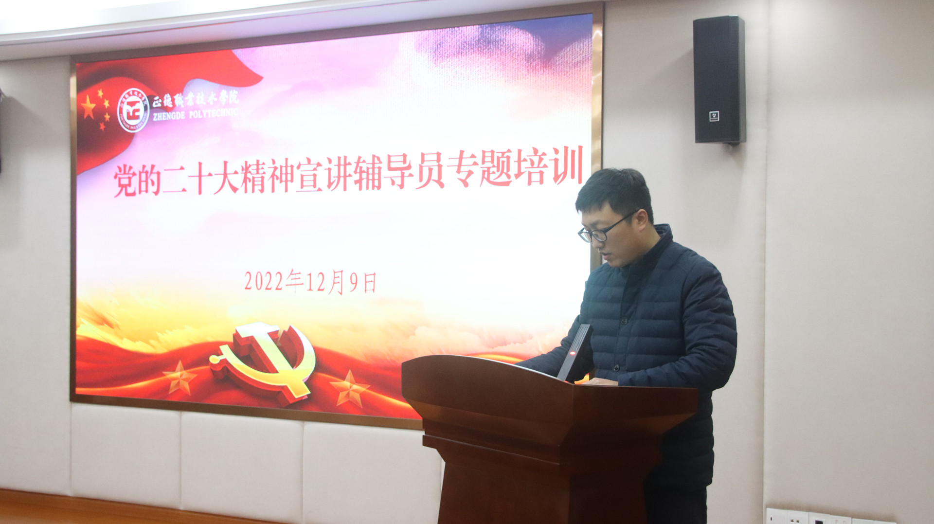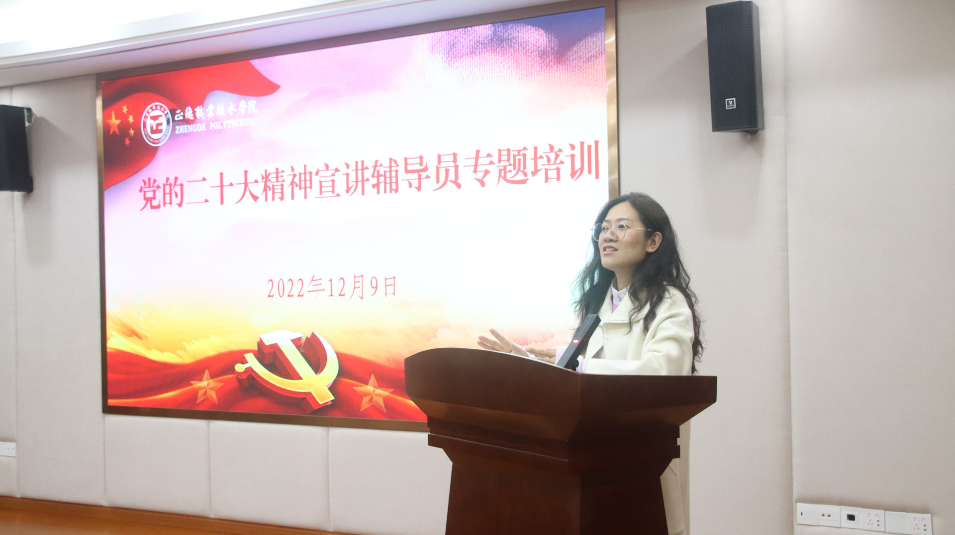 为学习宣传贯彻党的二十大精神,推动我院学生工作高质量发展,12月9日下午,学生处在5201会议室举办“党的二十大精神宣讲辅导员专题培训会”。院党委副书记、副院长任慈、院长助理王健、党委学生工作部部长、学生处处长祝佳俊及全体学工人员参加培训。会议由祝佳俊主持。