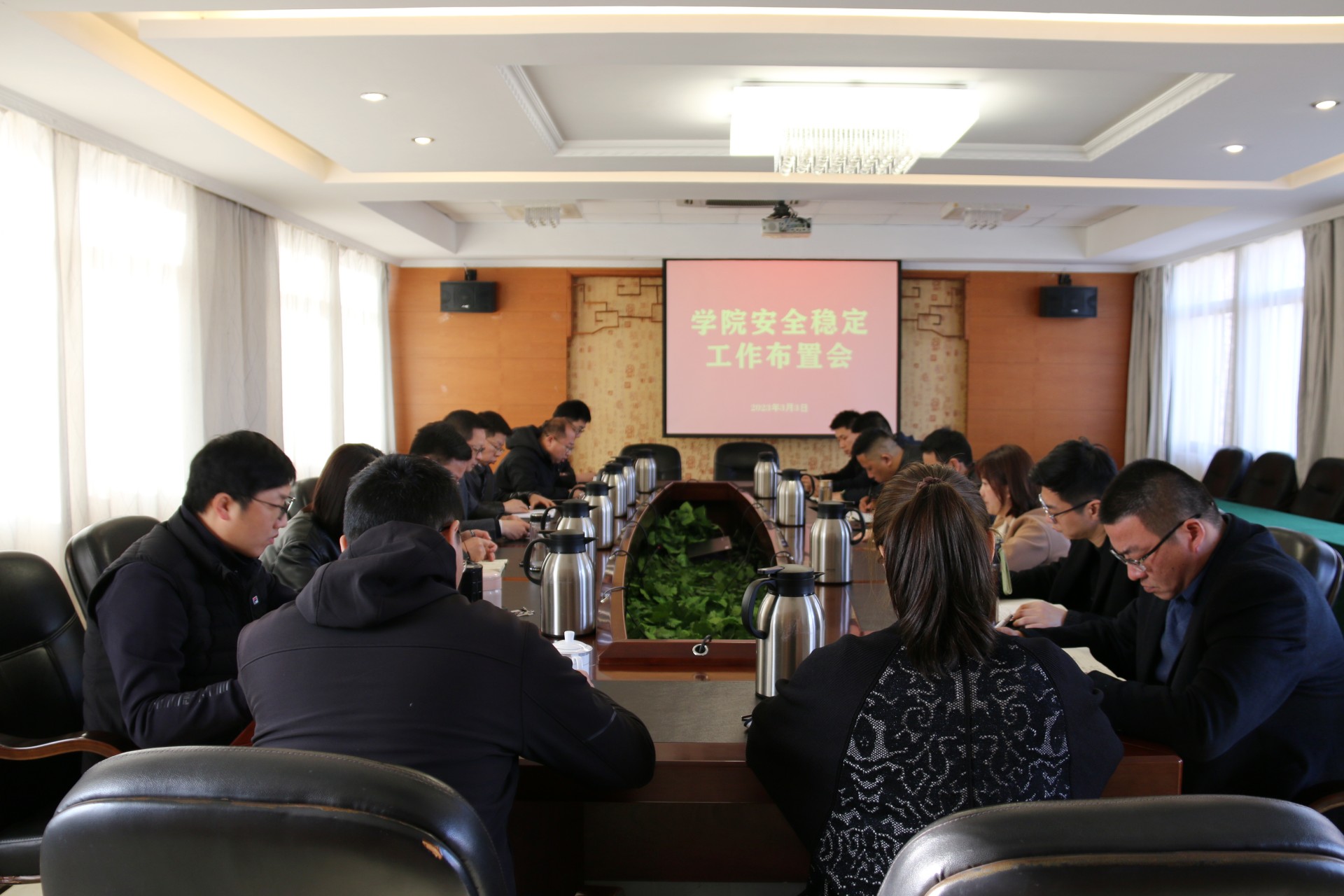 3月3日,我院召开安全稳定工作会议,安排部署学院近期安全稳定工作。党委书记孙雷,副院长高斌、赵凯雷、任慈出席会议,党政办、党群工作部、教务处、学生处、后勤处、保卫处负责人以及各系党支部书记参加了会议。