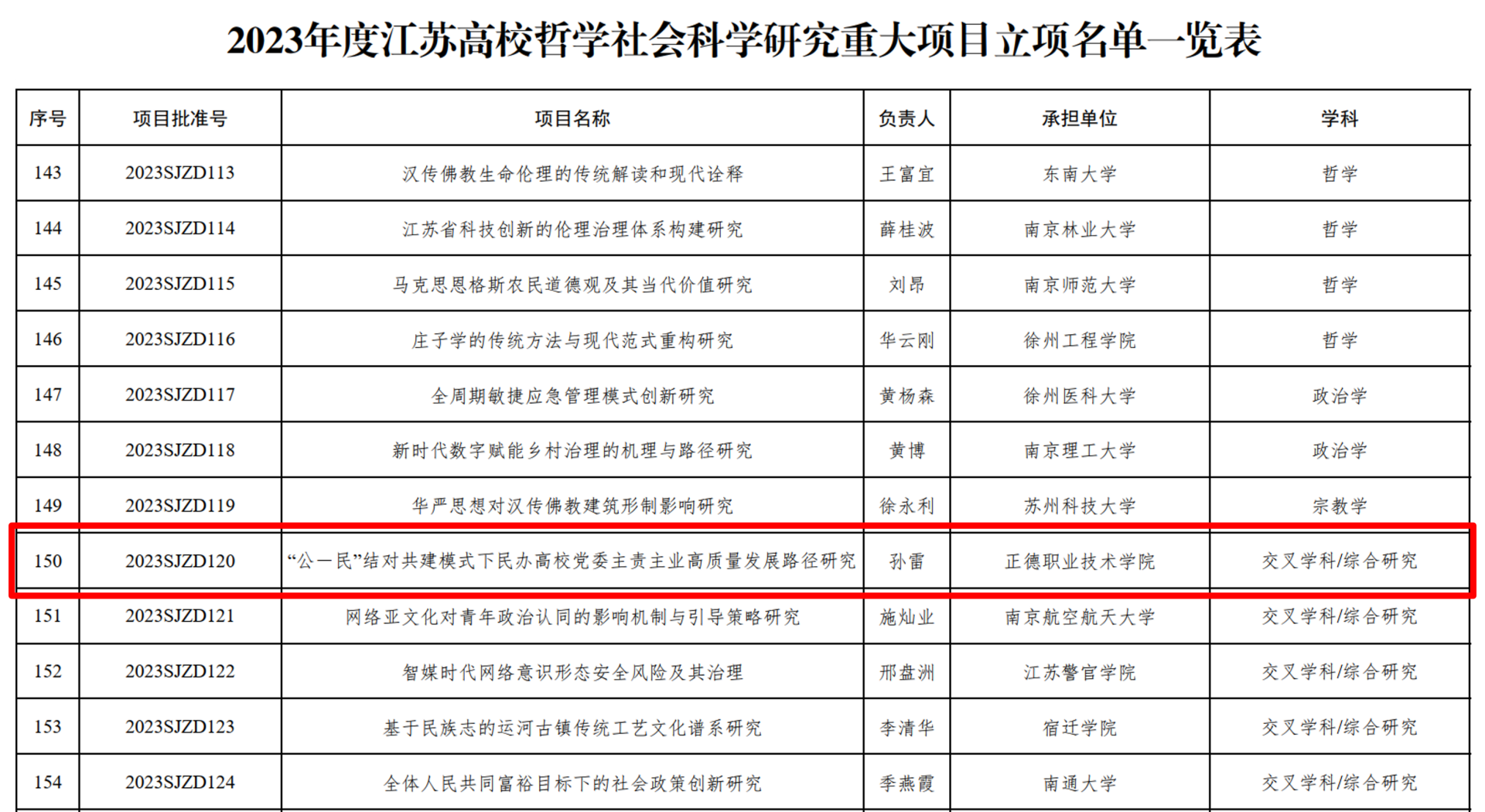 江苏高校哲学社会科学研究重大项目是由江苏省教育厅组织评审、省哲学社科界规格较高的重要科研项目。2023年度共批准设立179项,其中14所职业院校(本专科)获立16项,我校占据民办高职唯一一席。此次获得重大项目立项,实现了我校在省高校哲社研究项目领域重大项目的零突破,也是我校党建领域第一次获批省级科研项目立项,是学校“十四五”期间科研工作的新突破。