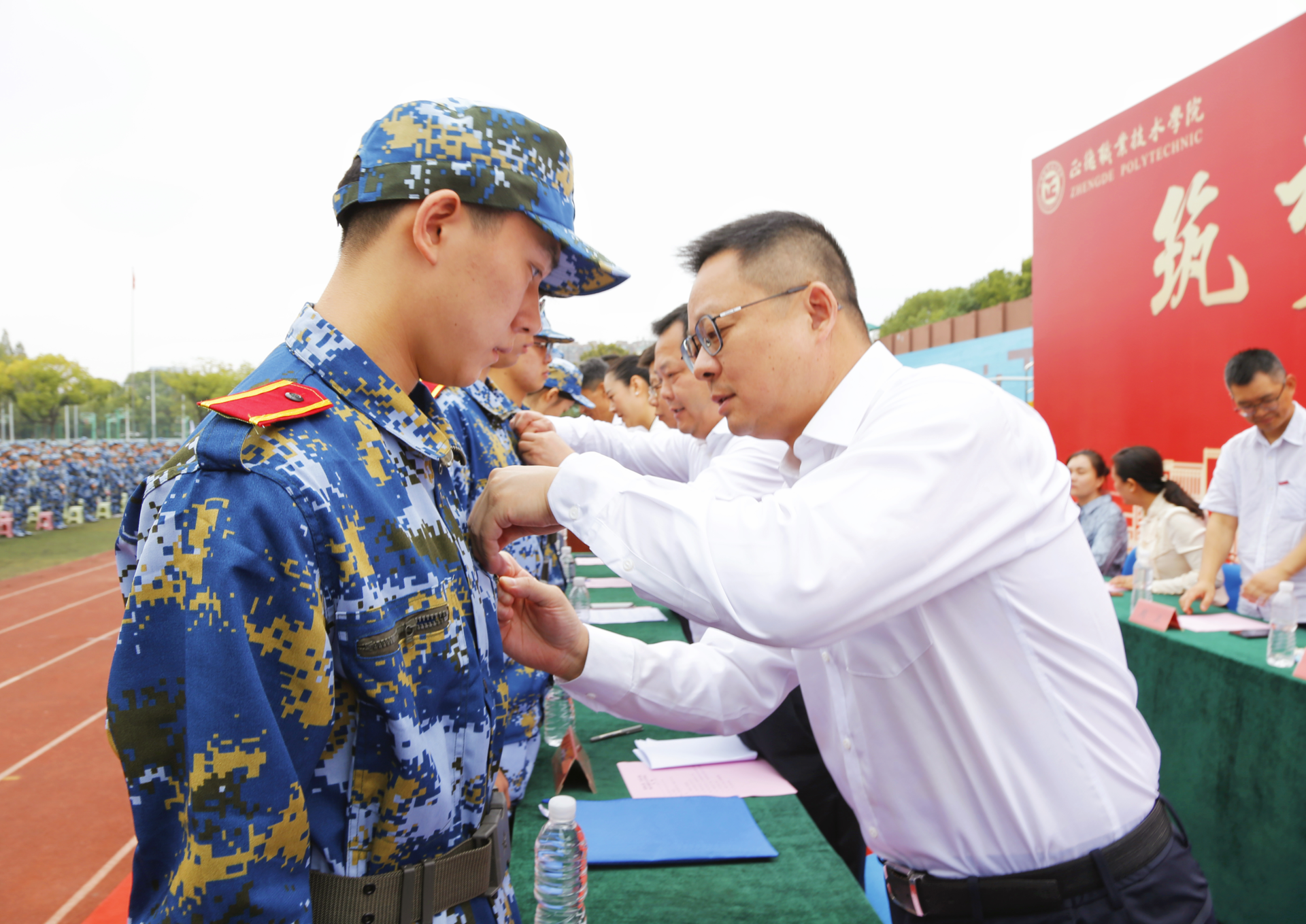 典礼上,学院领导为新生代表佩戴校徽。全体新生集体佩戴校徽并庄严宣誓,励志“做一名勤于学习、善于创造、甘于奉献、勇于担当、怀揣梦想的正德人”。