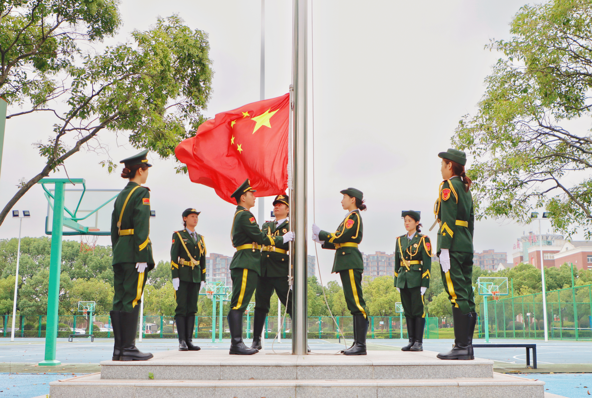 国旗护卫队步履铿锵护送五星红旗入场。全体师生肃立行礼,国歌震震奏响,国旗迎风飘扬。