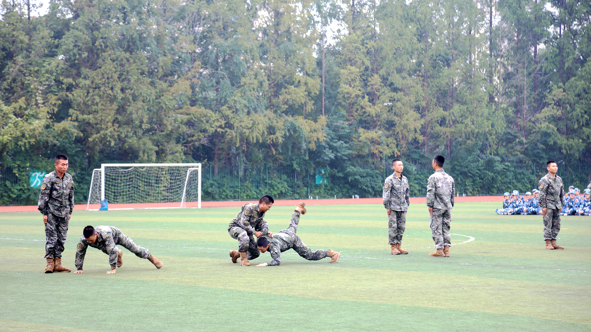 教官们的擒敌拳和战术演练展现了过硬的格斗技巧与完美的团队配合,引发同学们齐声惊叹,一阵阵掌声经久不息。