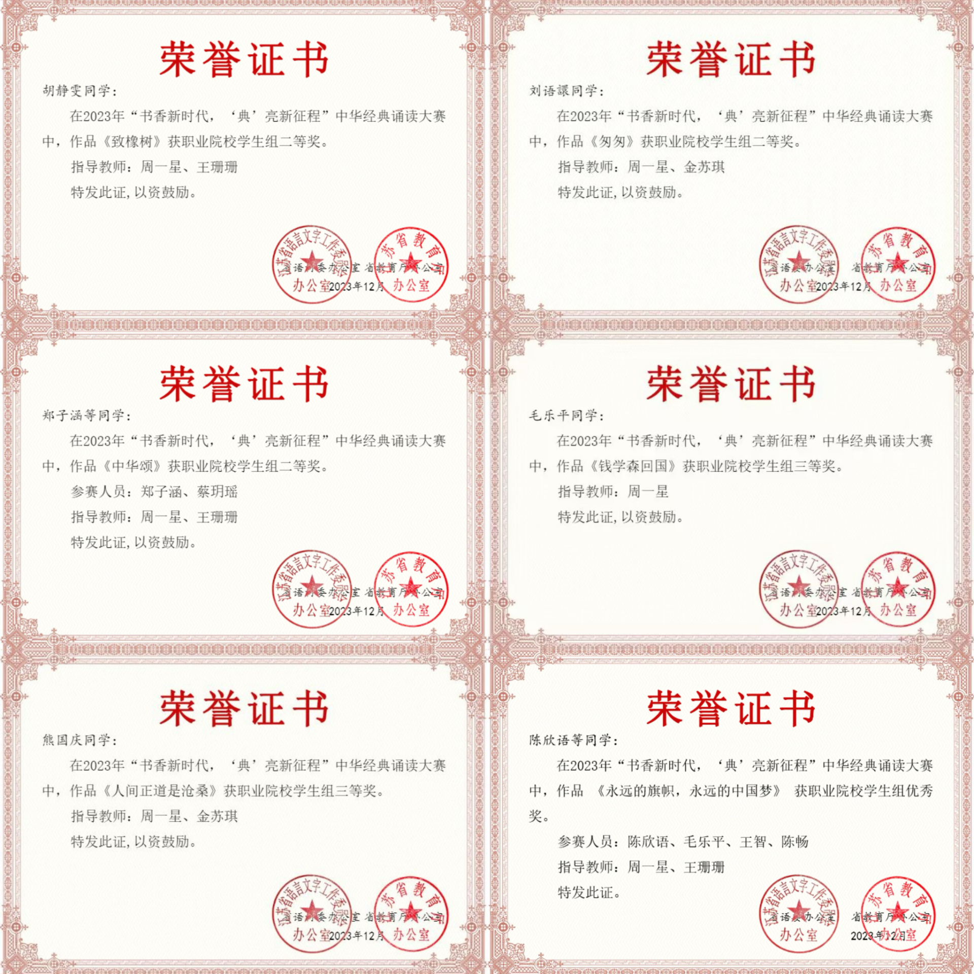 近日,省语材委办公室、省教育厅办公室等部门组织的 “书香新时代、‘典’亮新征程”2023年度全省中华经典诵写讲系列活动落下帷幕。我院获得了二等奖4项、三等奖2项、优秀奖1项,7项参赛作品全部获奖的优异成绩。这是我院在该项比赛中取得的重大突破。