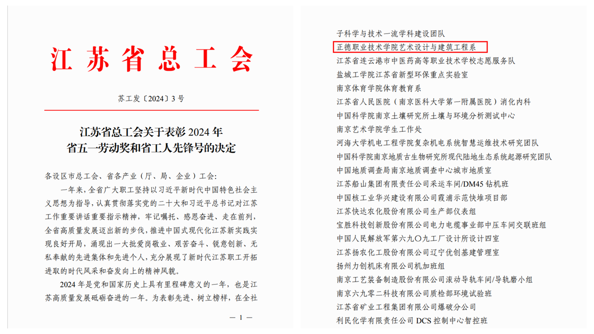 为表彰先进、树立榜样,在全社会弘扬劳模精神、劳动精神、工匠精神,4月23日,江苏省总工会下发了《关于表彰2024年省五一劳动奖和省工人先锋号的决定》的通知,我院艺术设计与建筑工程系荣获江苏省“工人先锋号”荣誉称号。
